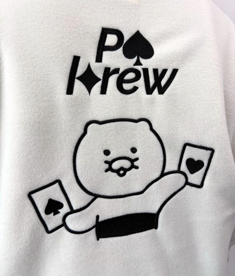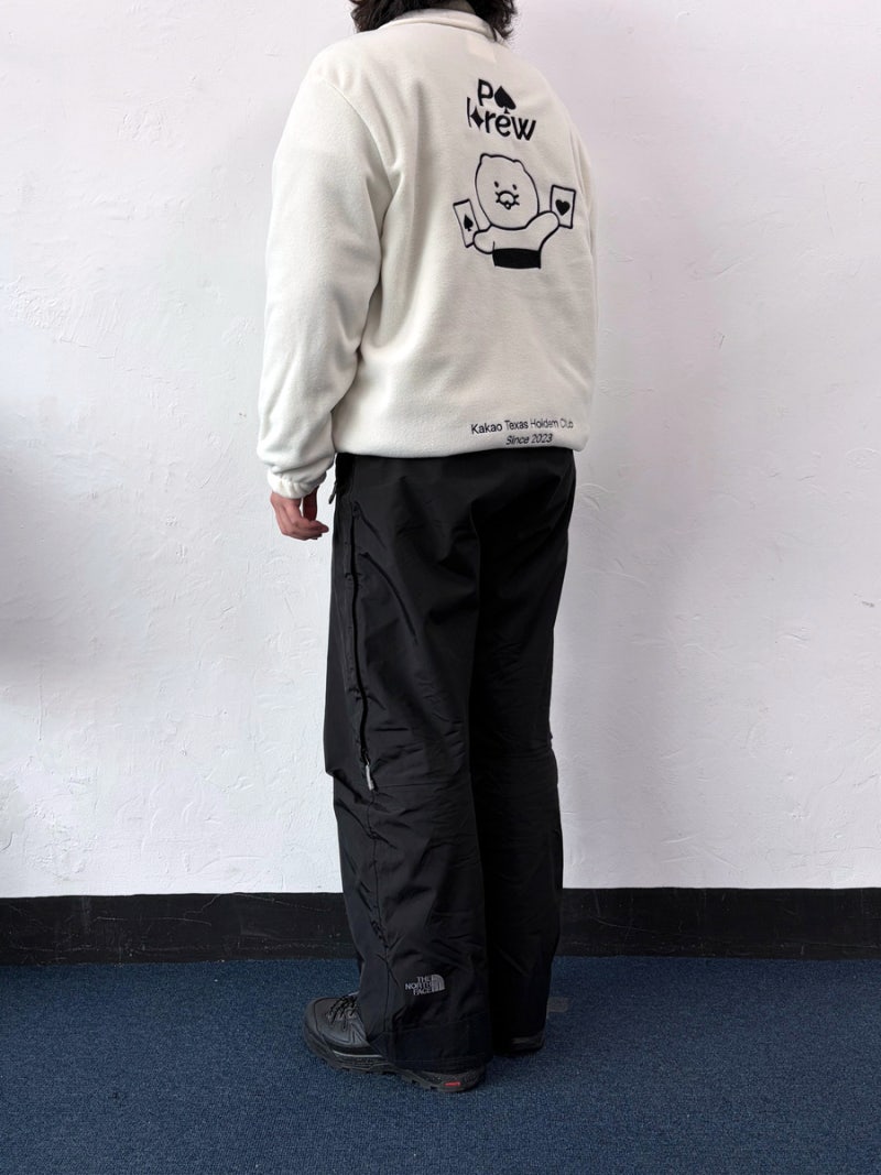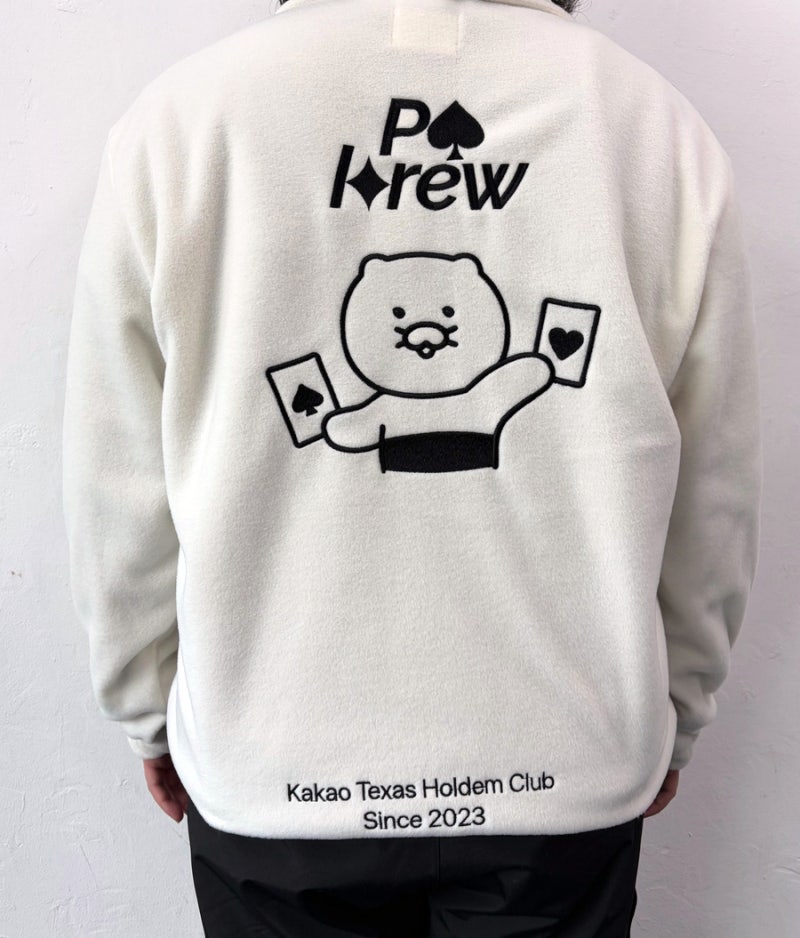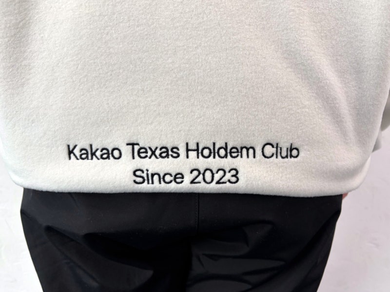 카카오에서는 화이트아이보리 컬러를 선택했으며, 왼쪽 가슴과 등판에는 자수 로고 작업을 적용해 깔끔하면서도 고급스러운 완성도를 더했습니다.