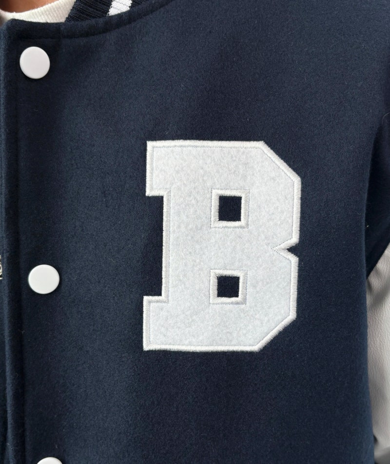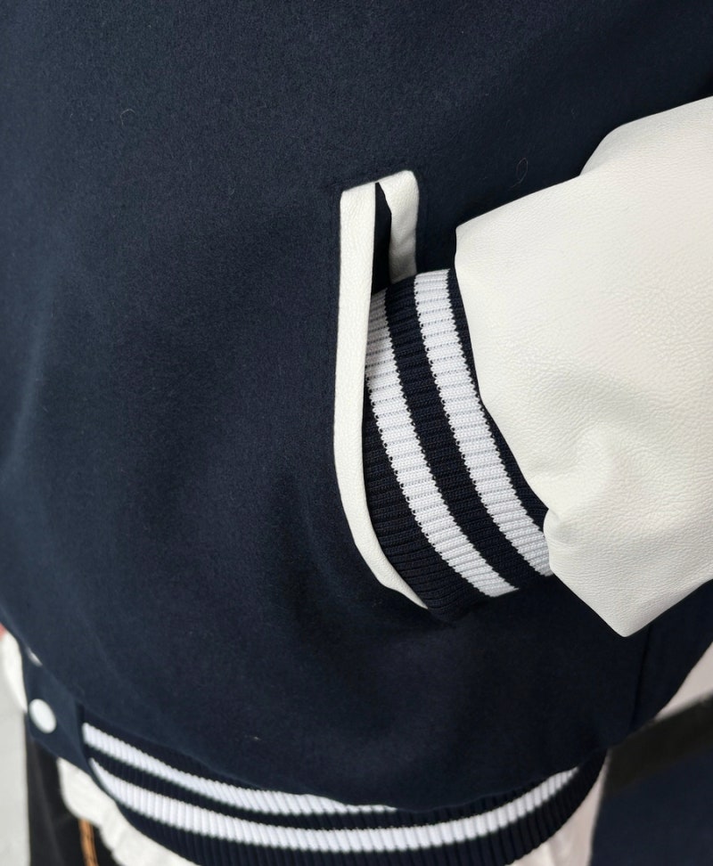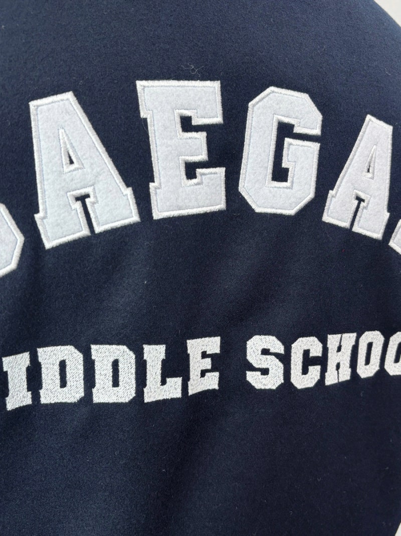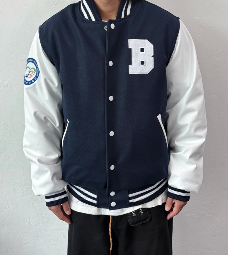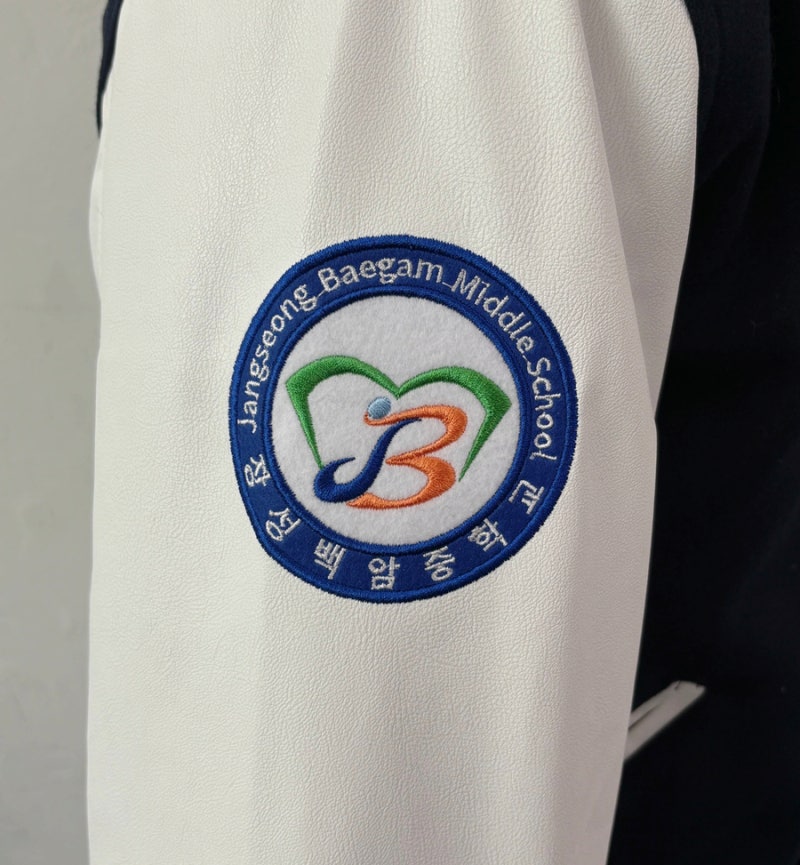 백암중학교에서는 하이미어 원단의 다크네이비 컬러와 화이트 인조 가죽 소매의 조화로 세련되고 강렬한 인상을 주며, 안감은 4온스 충전재 누빔 안감을 적용하였습니다. 또한 왼쪽 가슴과 오른쪽 소매, 등판에는 로고를 고급 자수로 새겨 넣어 특별함을 더했습니다.