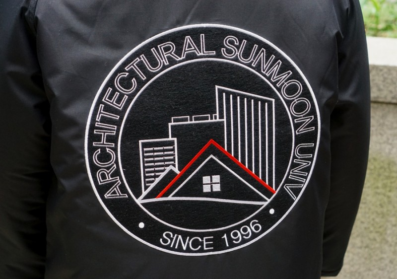 선문대학교에서는 메인 원단 컬러를 블랙으로 제작을 하였고, 왼쪽 가슴과 양쪽 팔, 그리고 등판에 로고를 자수로 새겼습니다.