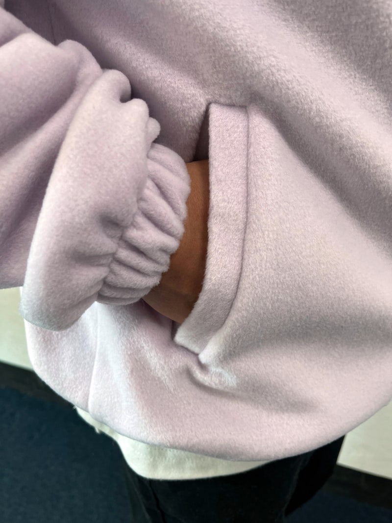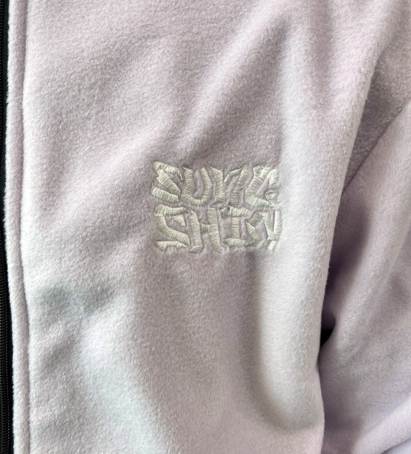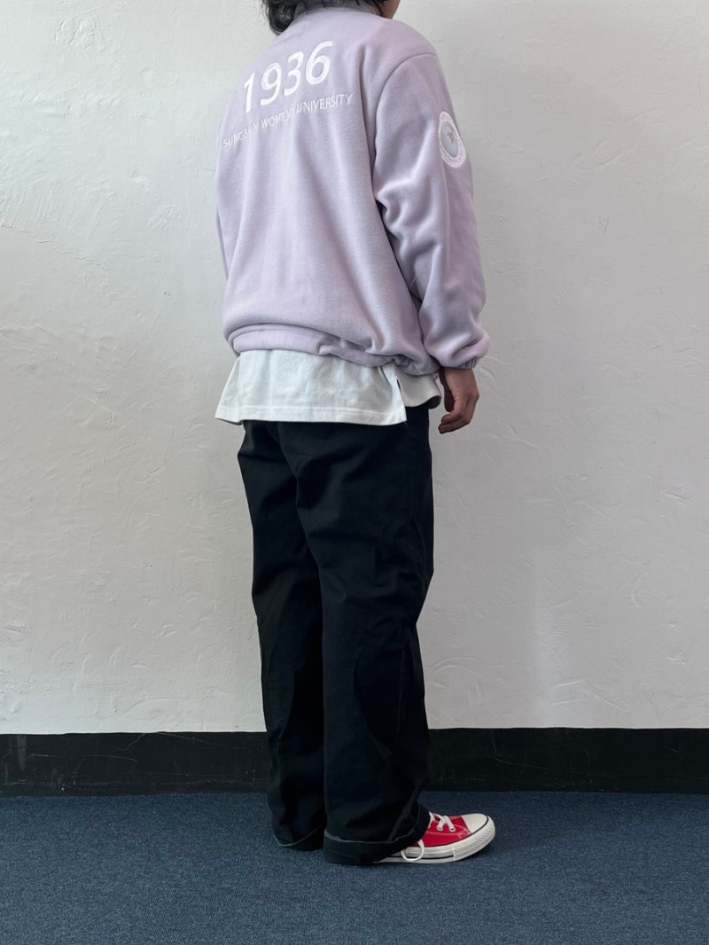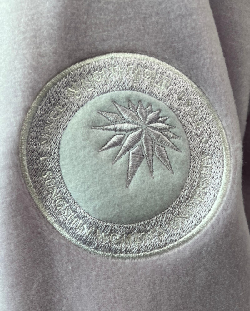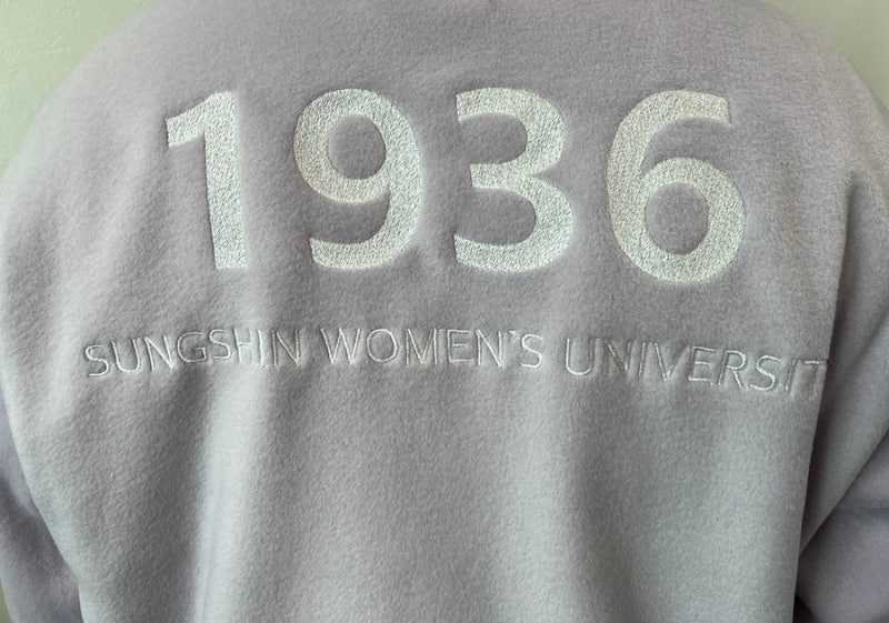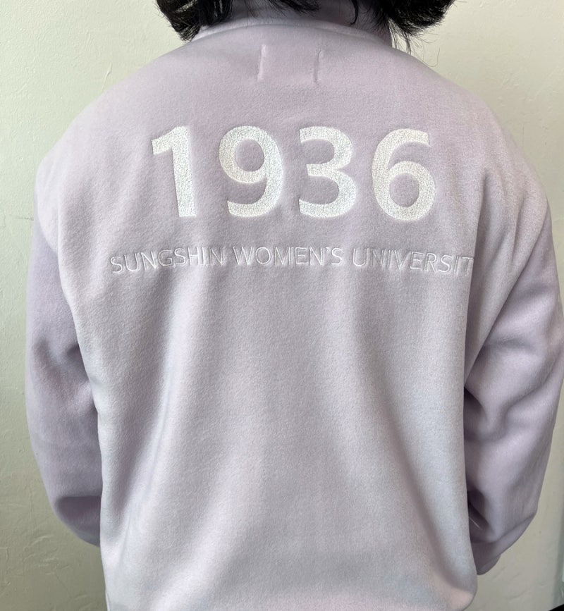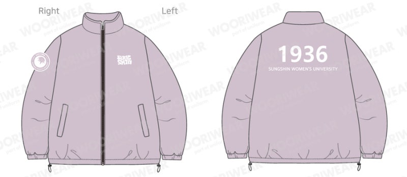 성신여자대학교에서는 베이비퍼플 컬러로 선택하였으며, 왼쪽 가슴과 오른쪽 소매, 등판에 자수 로고 작업이 들어가 고급스러운 디테일을 더했습니다.