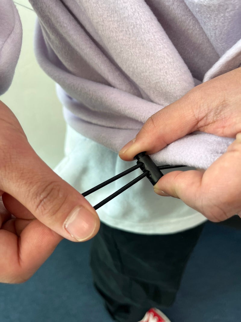 밑단 양쪽에는 스토퍼와 스트링이 있어 체형에 맞게 사이즈 조절이 가능합니다.