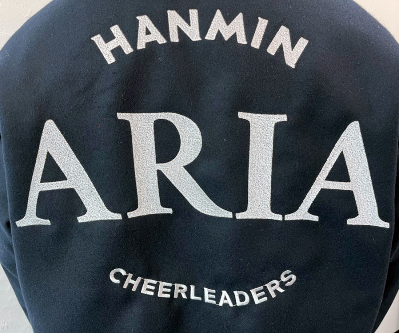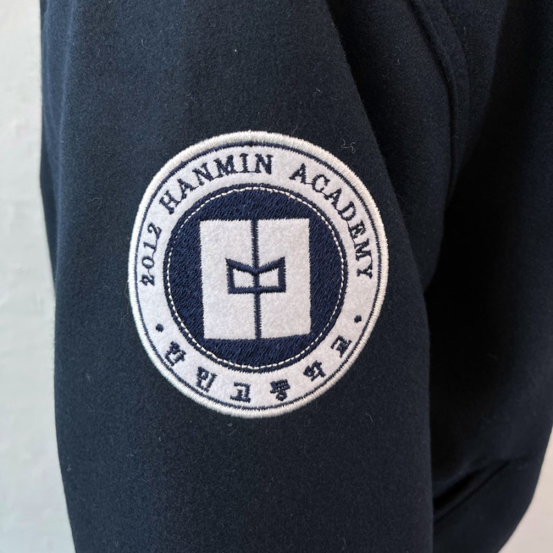 한민고등학교에서는 다크네이비 컬러 원단과 2온스 충전재 누빔 안감을 선택했으며, 왼쪽 가슴, 양쪽 소매, 등판에 자수 로고를 새겨 아이덴티티를 강조했습니다.