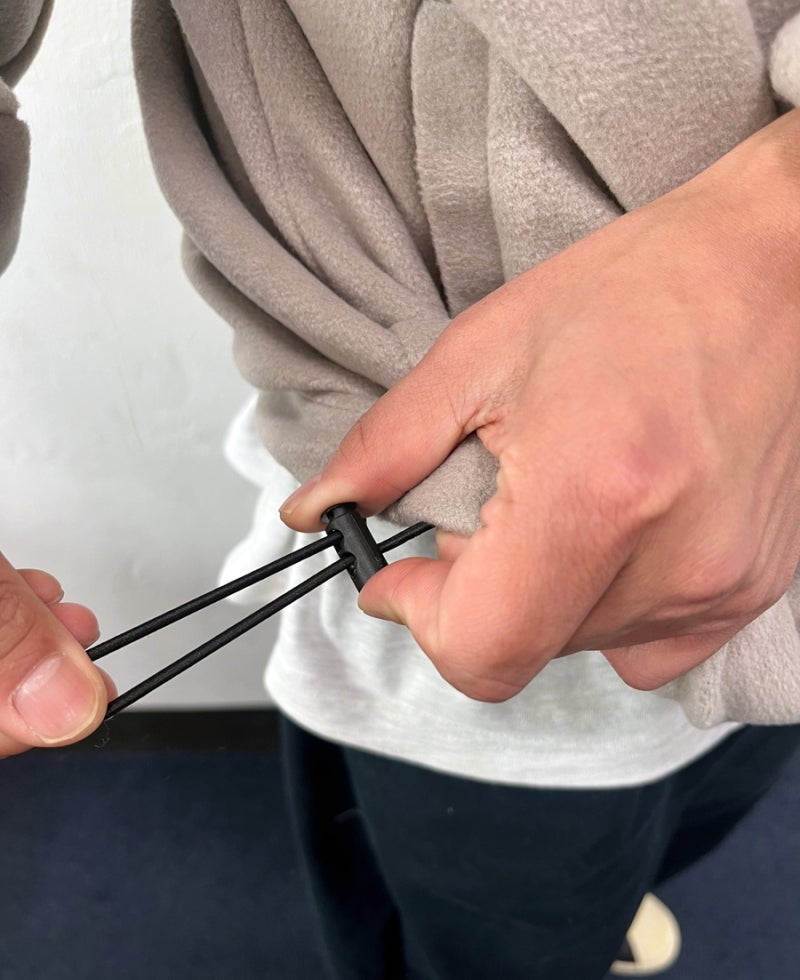 밑단 양쪽에는 스토퍼와 스트링이 있어 체형에 맞게 사이즈 조절이 가능합니다.