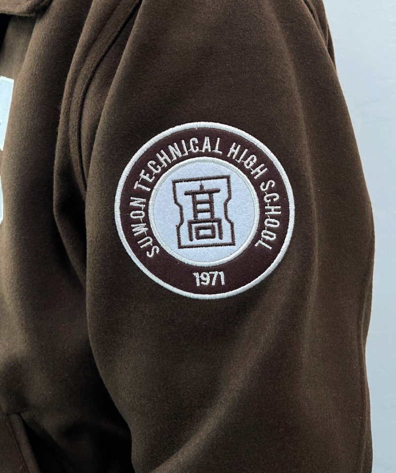 수원공업고등학교에서는 초코브라운 컬러 원단과 고밀도 트윌 안감을 선택했으며, 왼쪽 가슴, 왼쪽 소매, 등판에 자수 로고를 새겨 아이덴티티를 강조했습니다.