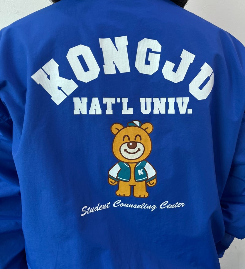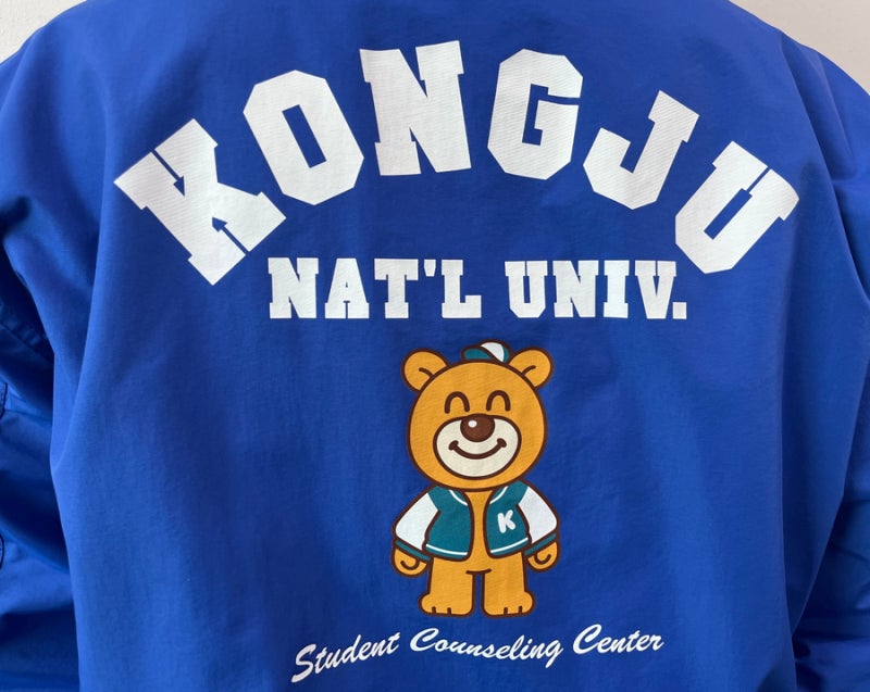 국립공주대학교는 메인 컬러로 블루를 선택하고, 안감은 고밀도 트윌 안감으로 제작하였습니다. 또한, 왼쪽 가슴과 등판에 열전사 인쇄(DTF) 프린팅 방식으로 로고를 새겨, 단체 고유의 아이덴티티를 정교하게 표현한 것이 특징입니다.