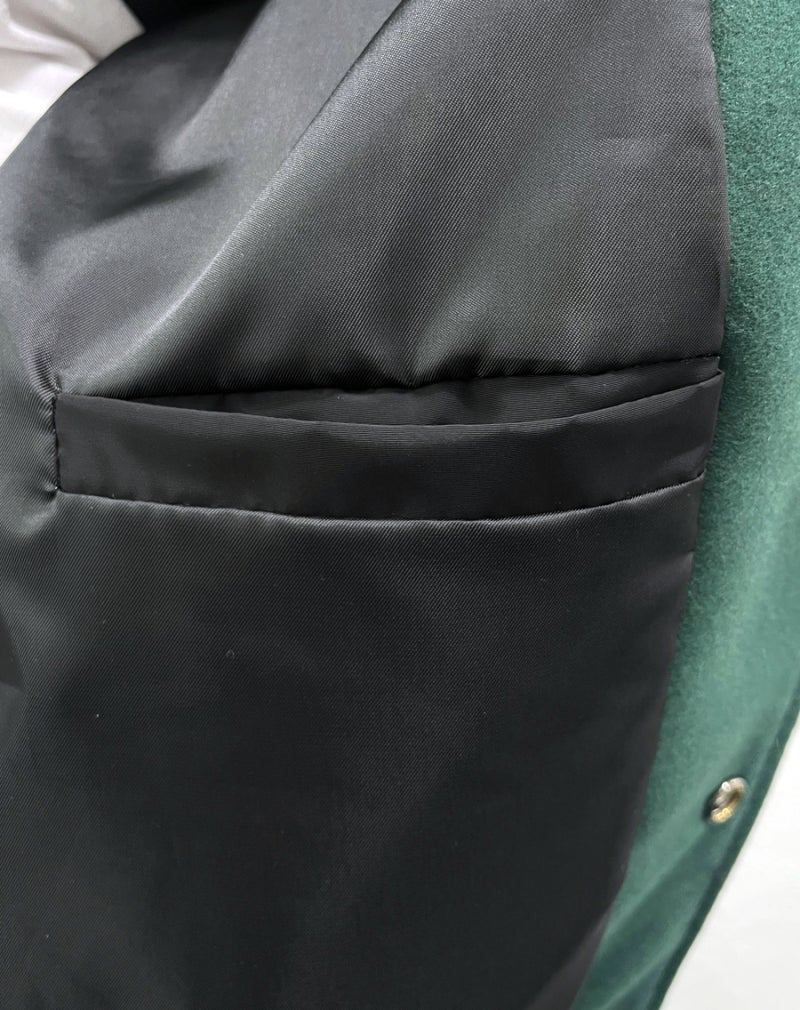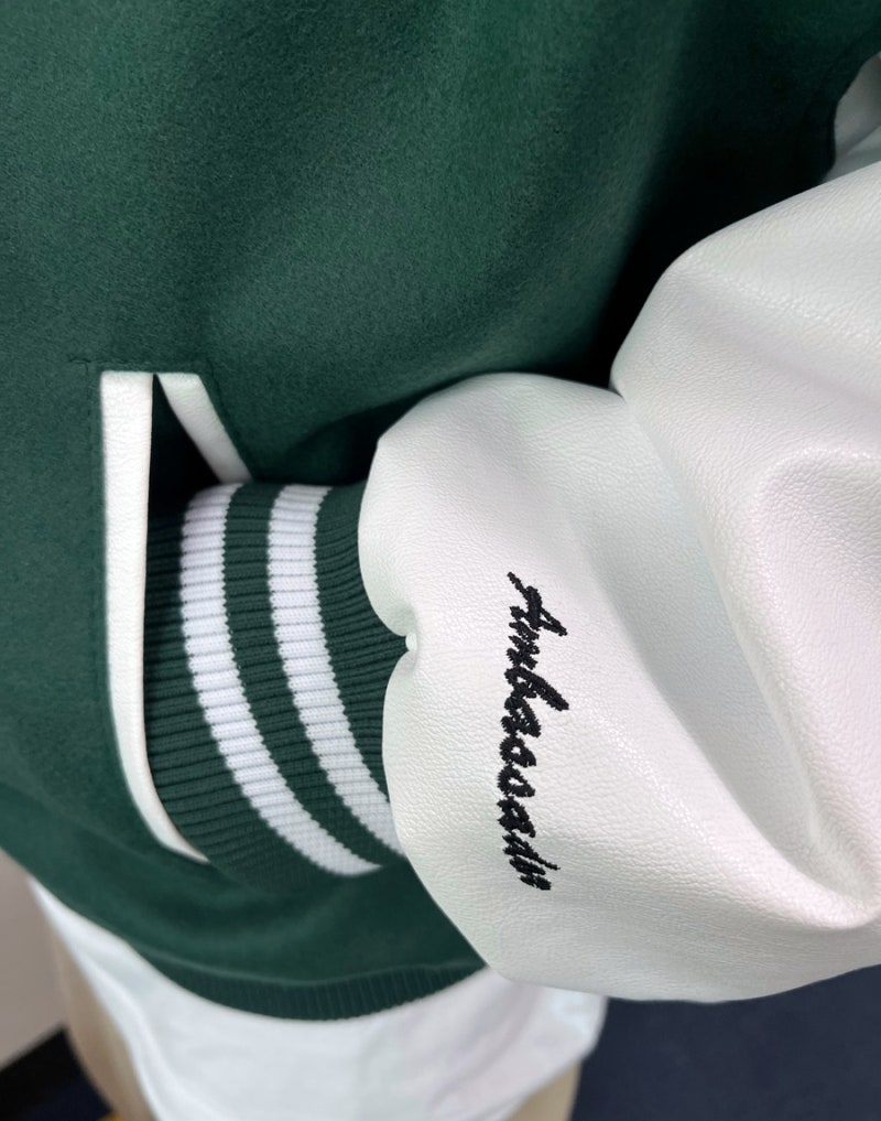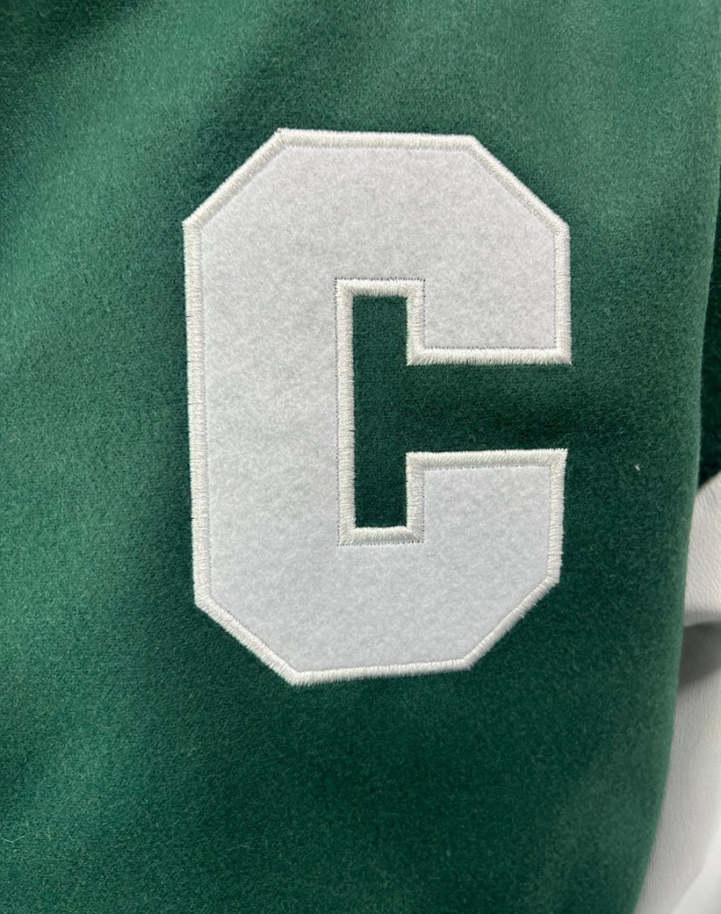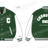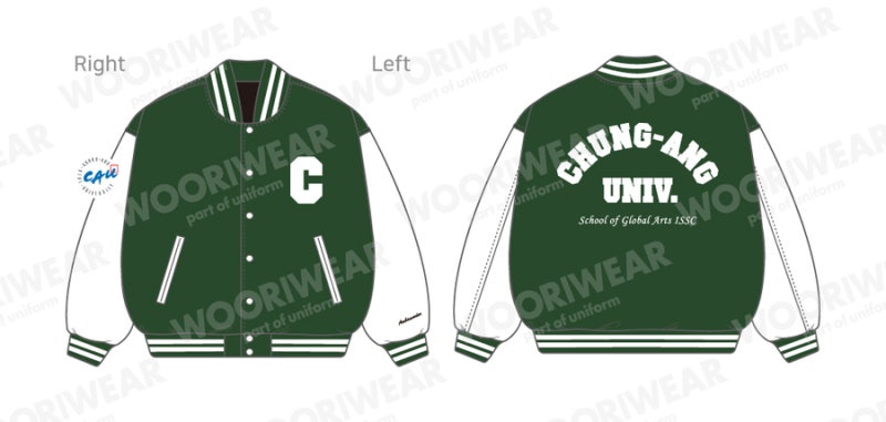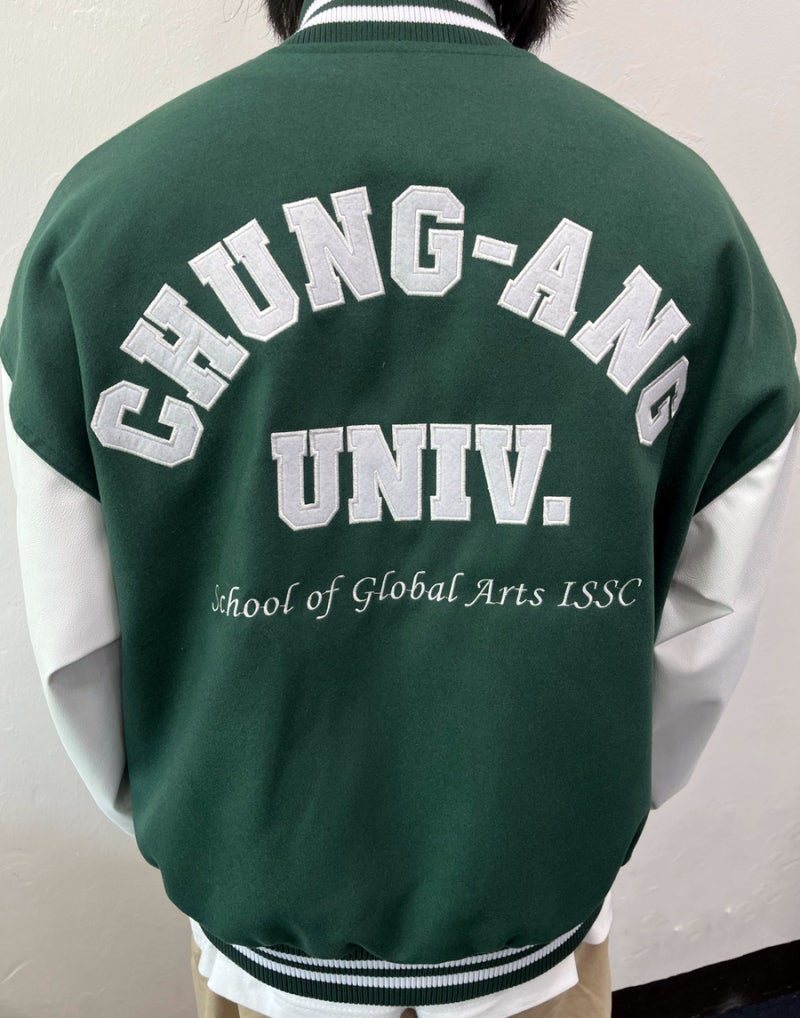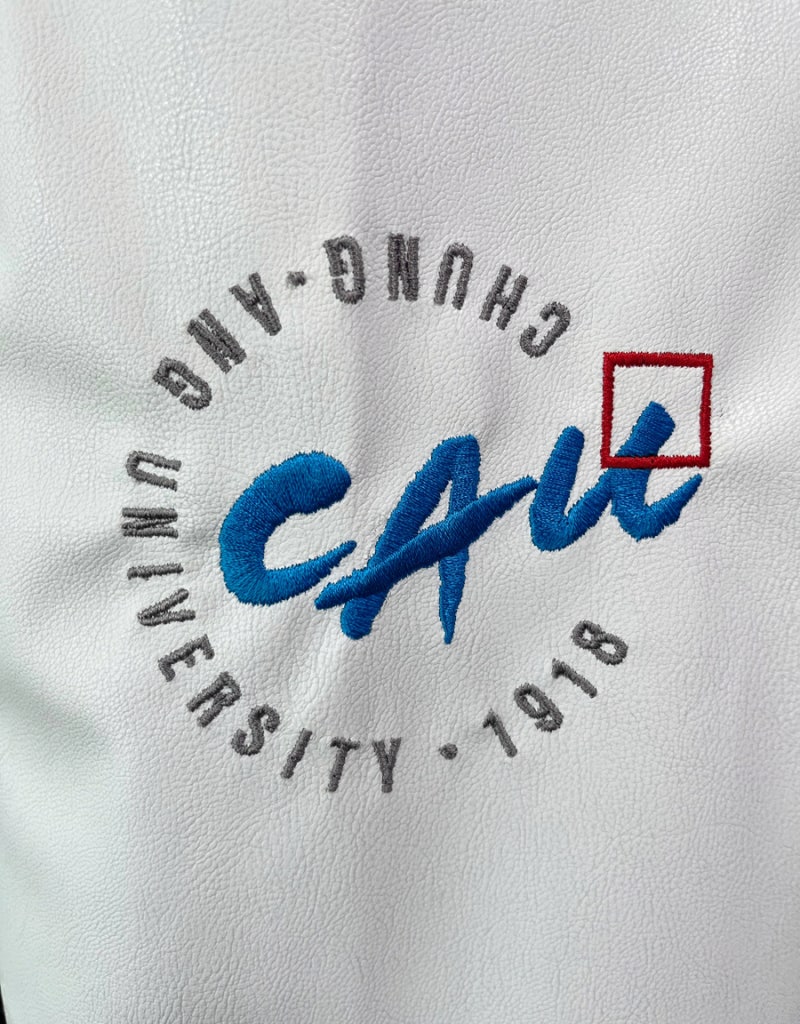중앙대학교에서는 하이미어 원단 포레스트 그린과 인조 가죽 화이트로 선택했으며, 안감은 고밀도 트윌 안감을 적용했습니다. 또한, 왼쪽 가슴과 양쪽 소매, 등판에는 자수 방식으로 로고를 새겨 완성도를 높였습니다.