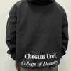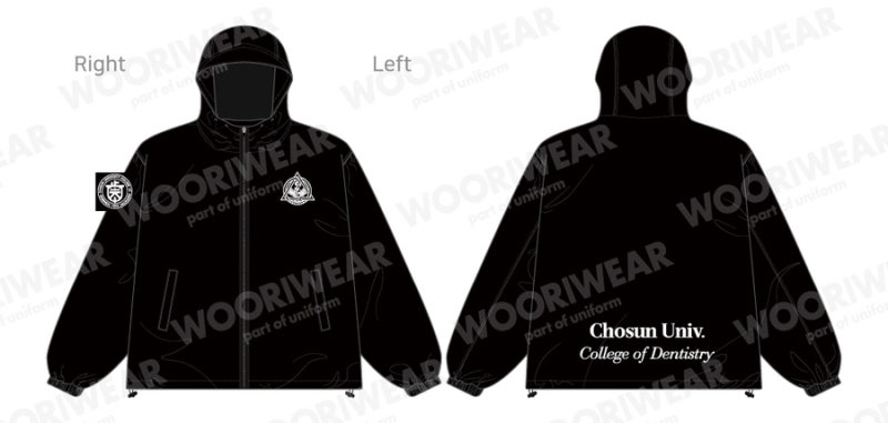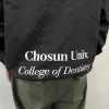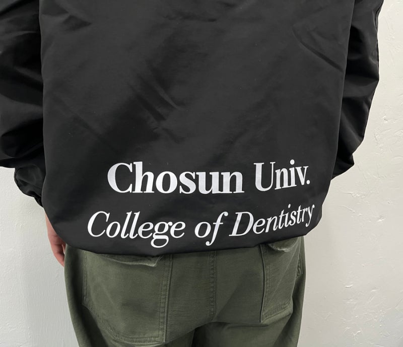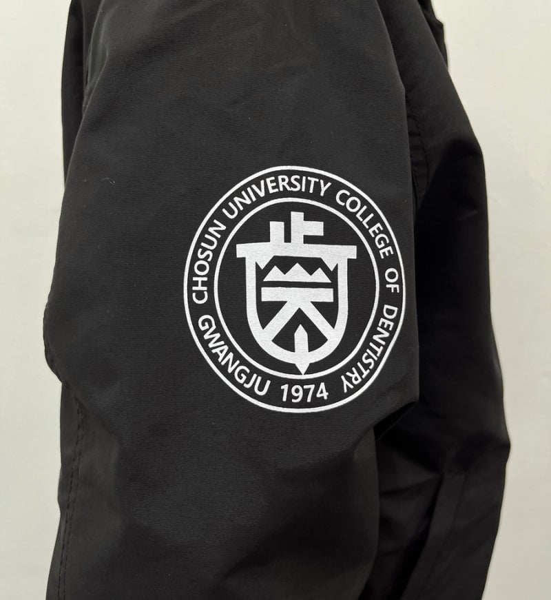 조선대학교에서는 블랙 컬러를 선택하였으며, 왼쪽 가슴과 오른쪽 소매, 등판에는 일반 날염(프린팅) 방식으로 로고를 새겨 개성을 더했습니다.