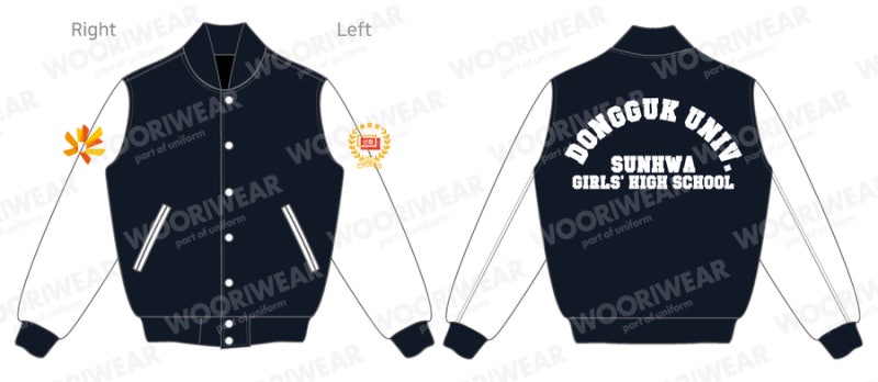 선화여자고등학교에서는 하이미어 원단 다크네이비, 인조 가죽 화이트 조합으로 세련된 색감을 구현했으며, 안감은 4온스 충전재 누빔 안감을 선택했습니다.