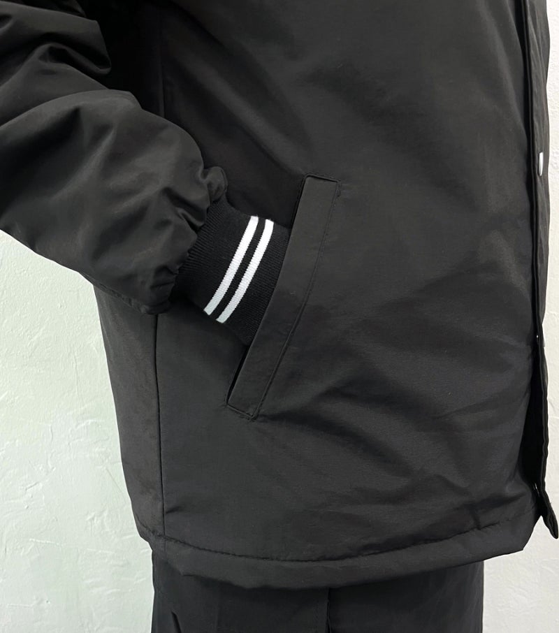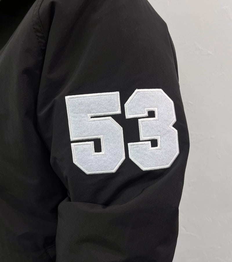 이번 제작에서는 메인 원단 컬러로 블랙을 선택하였고, 안감은 2온스 충전재 누빔 안감으로 마감하였습니다. 손목은 기본 시보리로 처리했으며, 왼쪽 가슴과 양쪽 소매, 등판에는 자수 방식으로 로고를 새겨 포인트를 주었습니다.