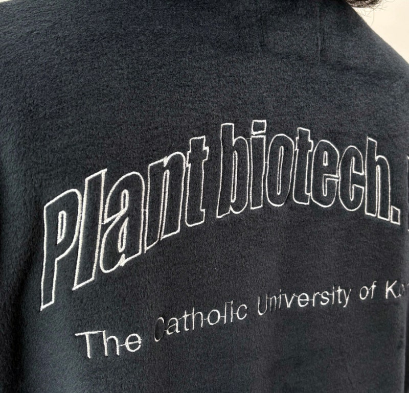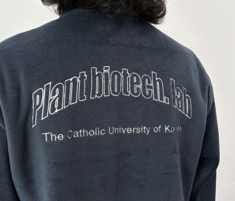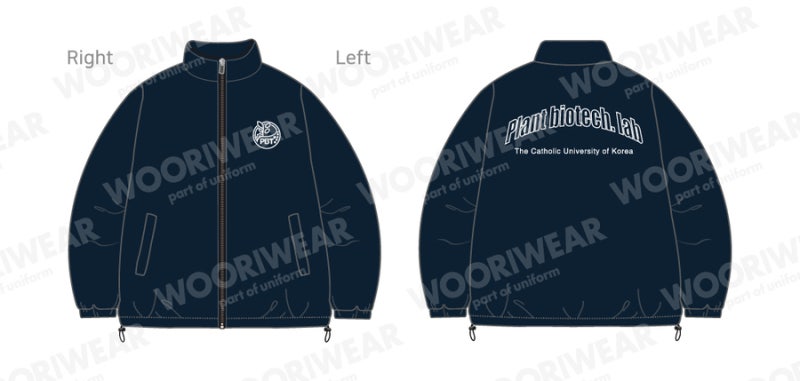 가톨릭대학교에서는 네이비 컬러로 선택하였으며, 왼쪽 가슴과 등판에 자수 로고 작업이 들어가 고급스러운 디테일을 더했습니다.