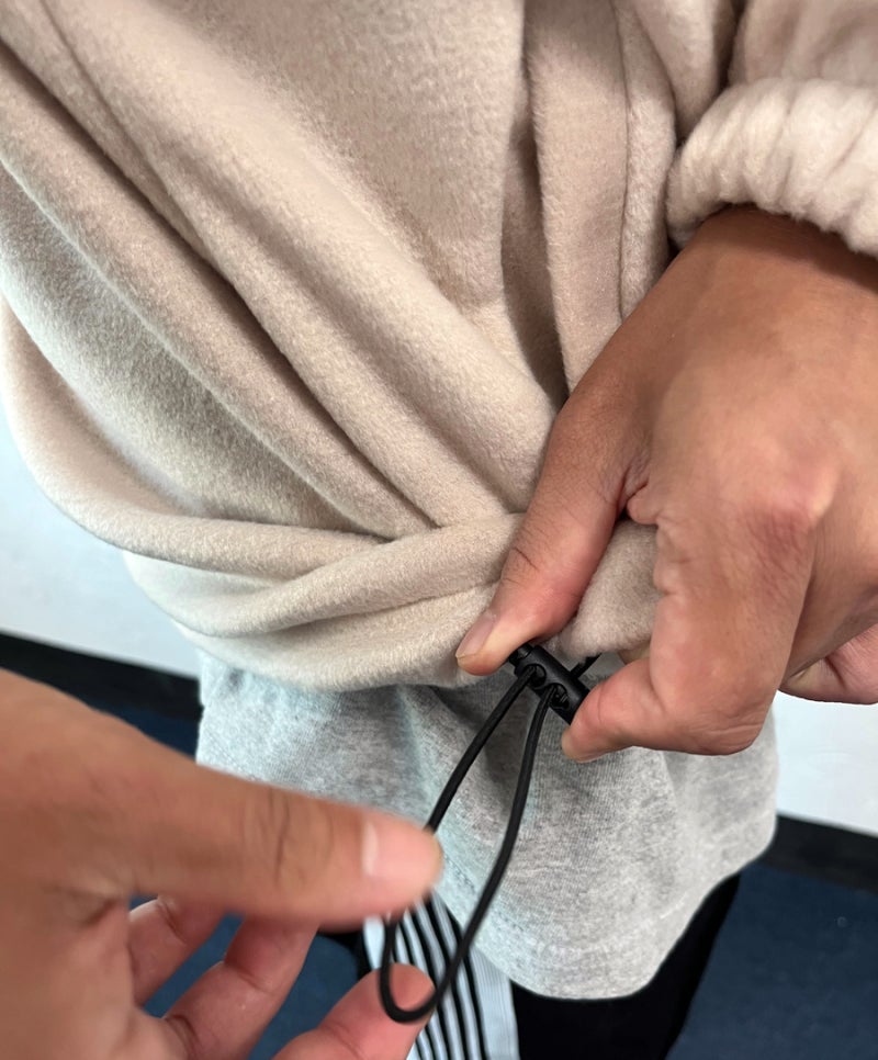 밑단 양쪽에는 스토퍼와 스트링이 있어 체형에 맞게 사이즈 조절이 가능합니다.