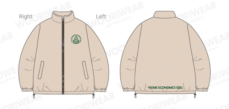 이번에 한국교원대학교에서는 라이트베이지 컬러를 선택했으며, 왼쪽 가슴과 등판의 자수 로고 작업을 통해 고급스럽고 완성도 높은 디자인을 완성했습니다.