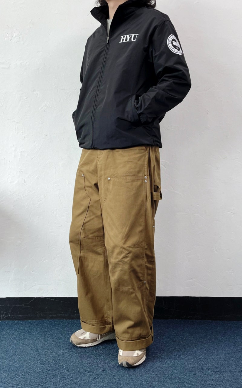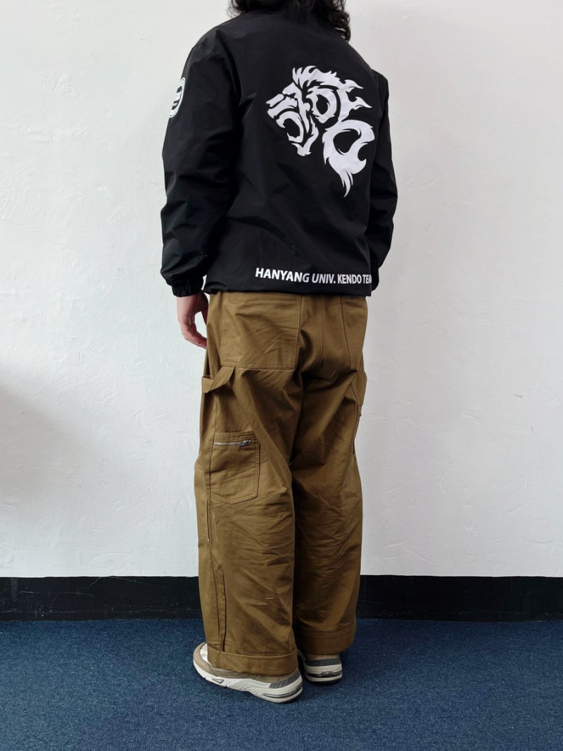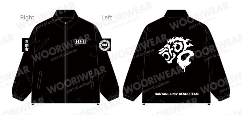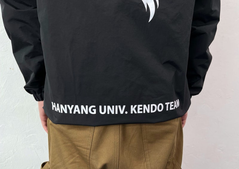 이번 한양대학교에서는 블랙 컬러로 선택하였으며, 왼쪽 가슴과 양쪽 소매, 등판에 일반 날염(프린팅) 방식으로 로고를 새겨 단체복의 정체성을 강조했습니다.