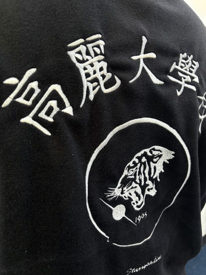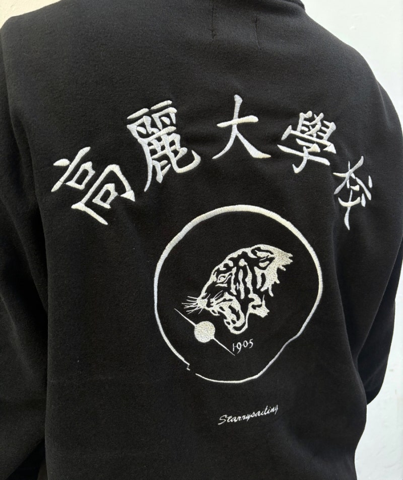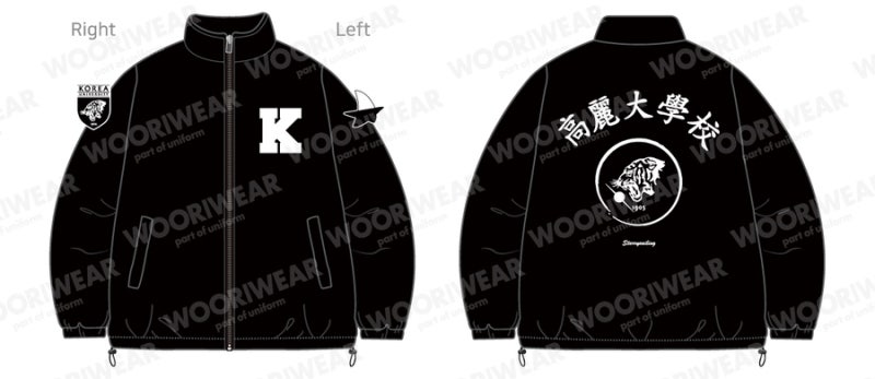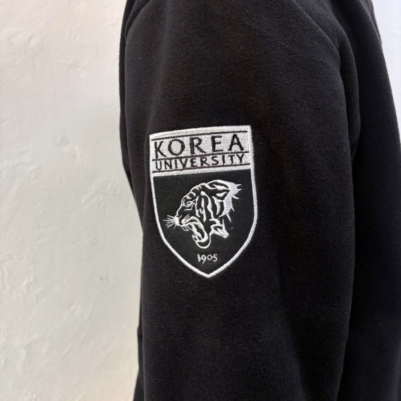 이번에 고려대학교에서는 블랙 컬러를 선택했으며, 왼쪽 가슴과 양쪽 소매, 등판의 자수 로고 작업을 통해 고급스럽고 완성도 높은 디자인을 완성했습니다.