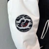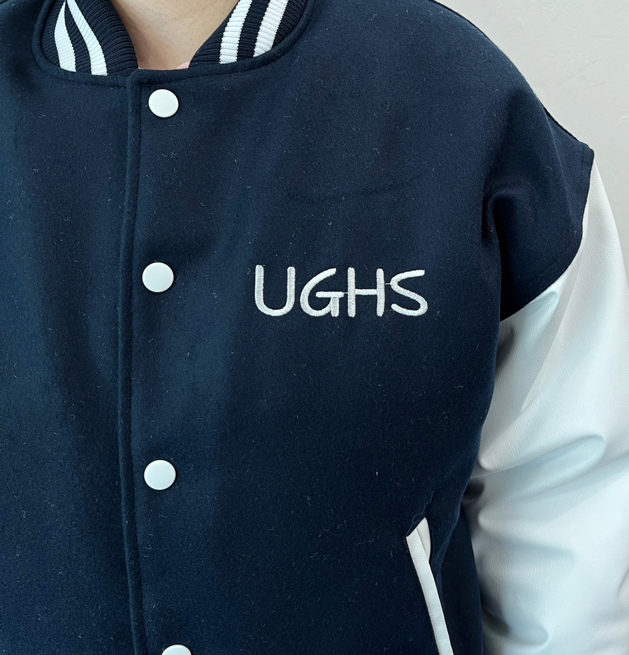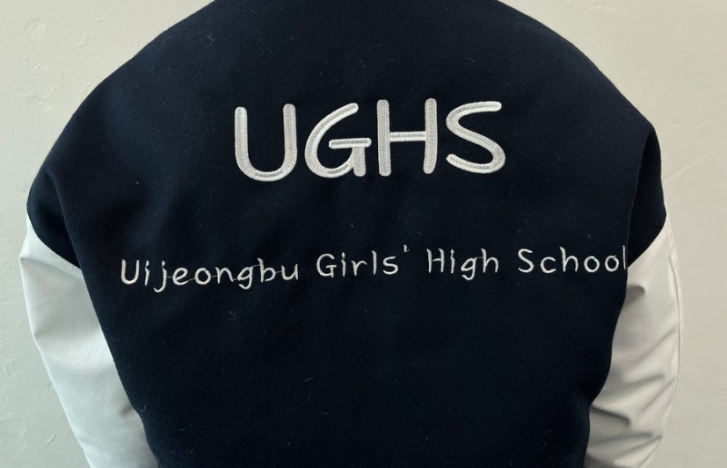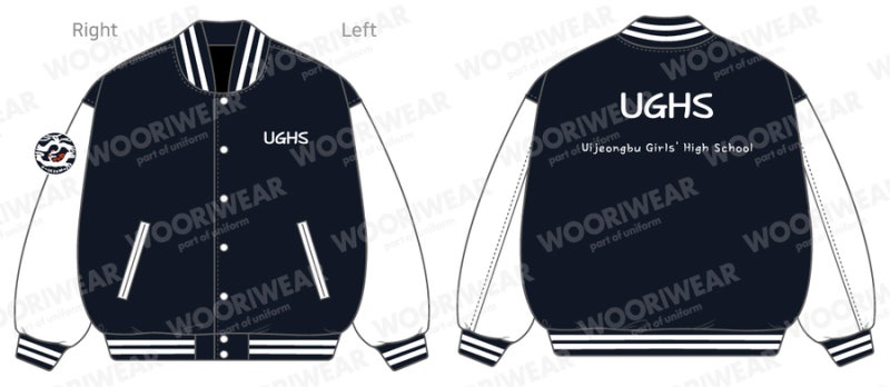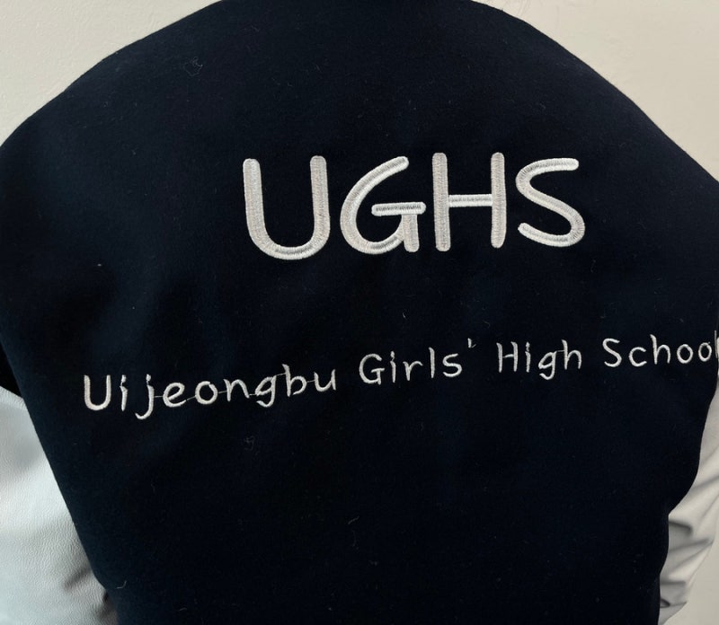의정부여자고등학교에서는 하이미어 원단 다크네이비과 인조 가죽 화이트로 선택했으며, 안감은 4온스 충전재 누빔 안감을 적용했습니다. 또한, 왼쪽 가슴과 오른쪽 소매, 등판에는 자수 방식으로 로고를 새겨 완성도를 높였습니다.