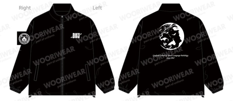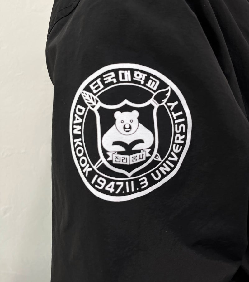 이번 단국대학교에서는 블랙 컬러로 선택하였으며, 왼쪽 가슴과 오른쪽 소매, 등판에 일반 날염(프린팅) 방식으로 로고를 새겨 단체복의 정체성을 강조했습니다.
