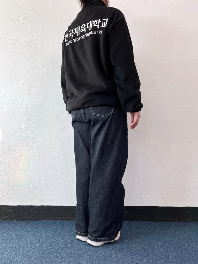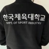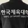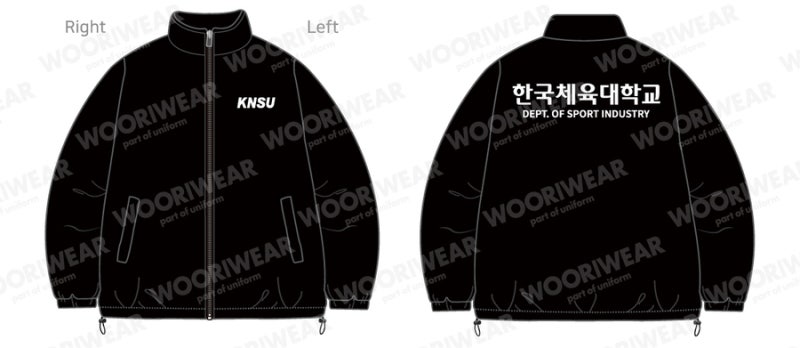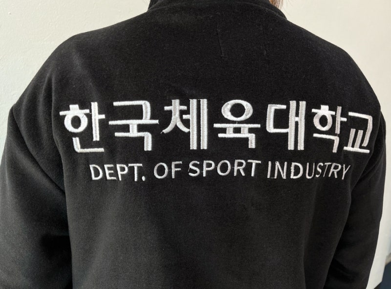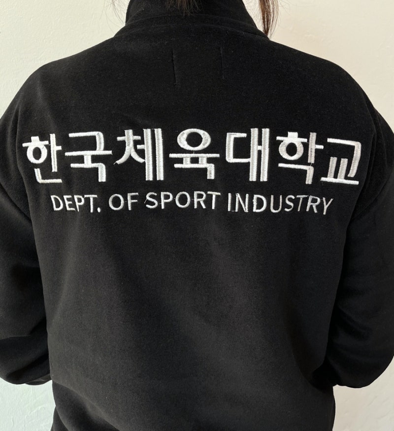 이번에 한국체육대학교에서는 블랙 컬러를 선택했으며, 왼쪽 가슴과 등판의 자수 로고 작업을 통해 고급스럽고 완성도 높은 디자인을 완성했습니다.