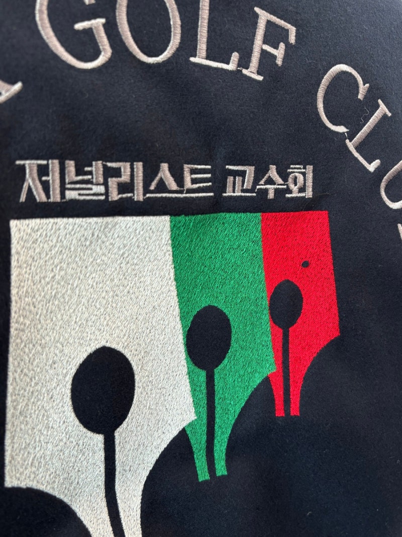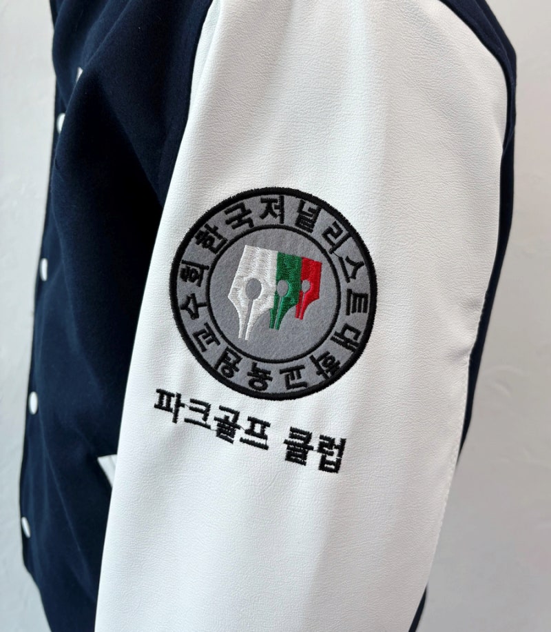한국저널리스트대학교에서는 하이미어 원단의 다크네이비 컬러와 화이트 인조 가죽 소매의 조화로 세련되고 강렬한 인상을 주며, 안감은 고밀도 트윌 안감을 적용하였습니다. 또한 왼쪽 가슴과 양쪽 소매, 등판에는 로고를 고급 자수로 새겨 넣어 특별함을 더했습니다.