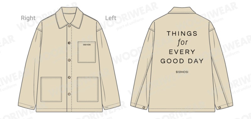 시시호시팀에서는 라이트베이지 컬러를 선택했고, 왼쪽 가슴 포켓 부분과 등판에 일반 날염(프린팅)으로 로고를 새겨 완성도를 더욱 높였습니다.