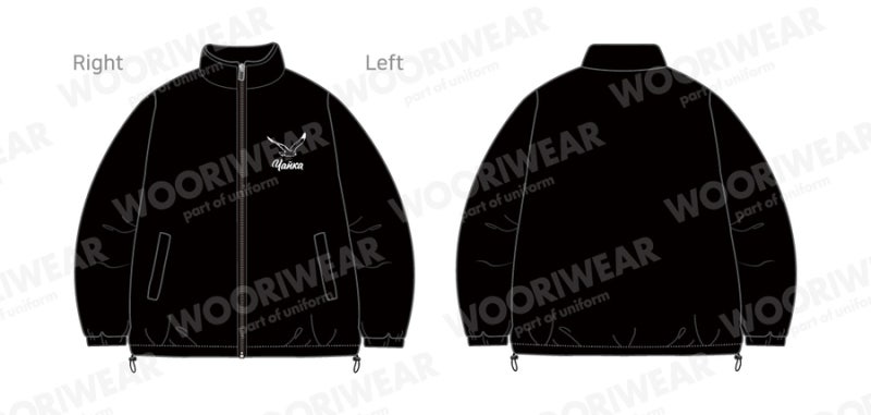 갈매기에서는 원단 컬러를 블랙으로 선택하고, 왼쪽 가슴에는 로고 자수를 새겨 차별화된 디자인을 완성했습니다.