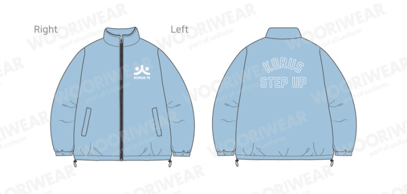 한국산업기술진흥원에서는 원단 컬러를 스카이블루로 선택하고, 왼쪽 가슴과 등판에는 로고 자수를 새겨 차별화된 디자인을 완성했습니다.