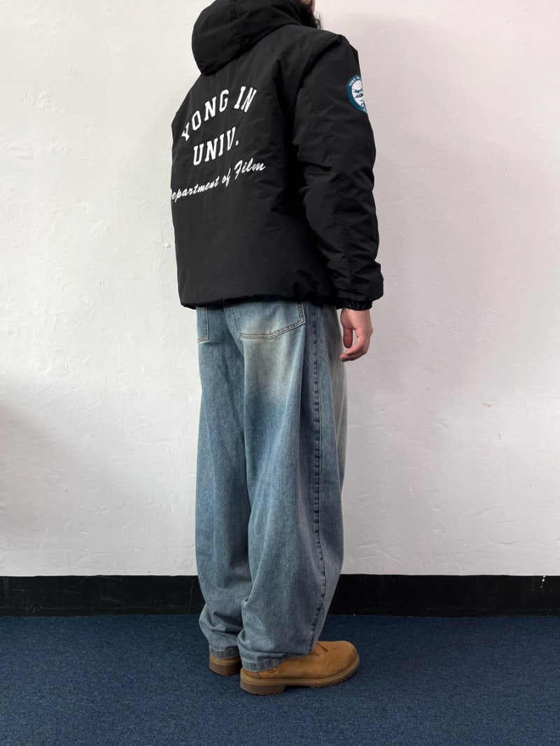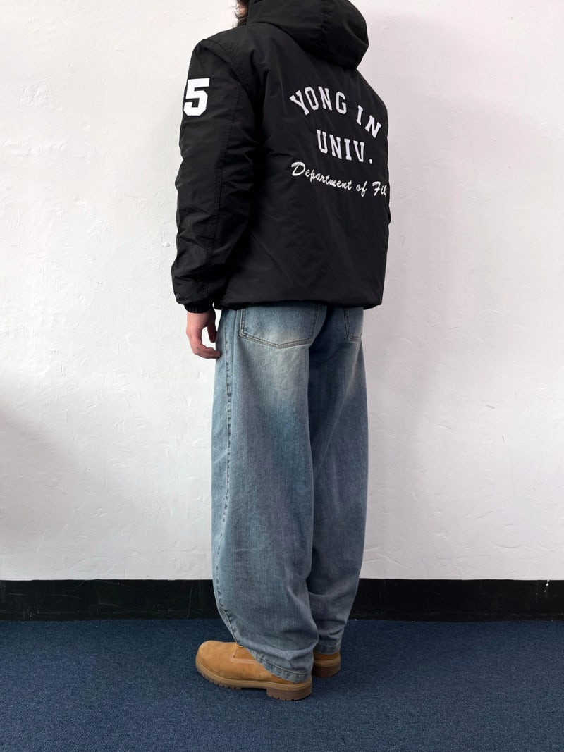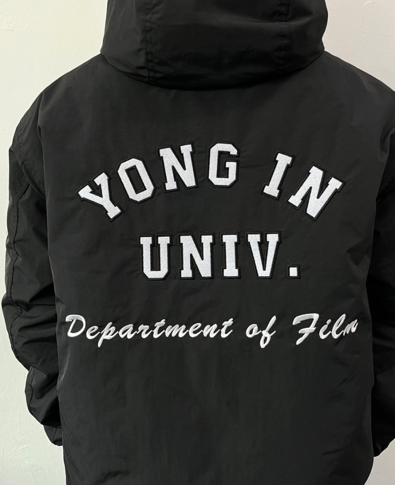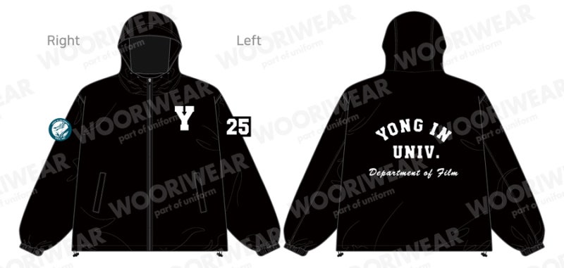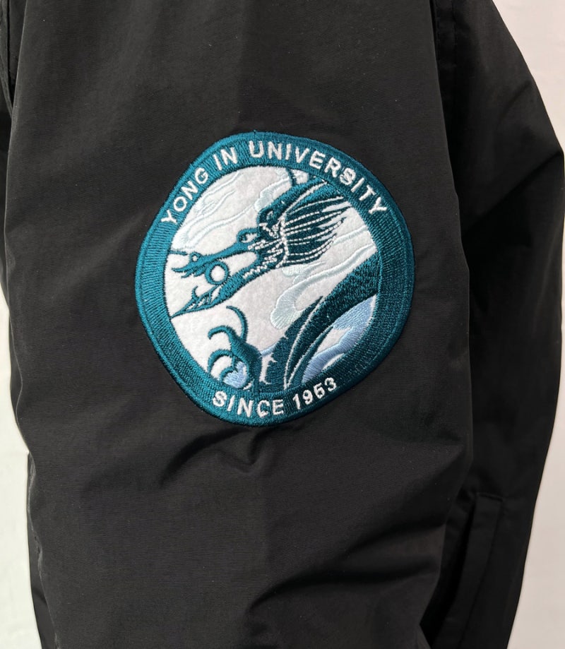 용인대학교는 블랙 컬러를 선택했으며, 왼쪽 가슴·양쪽 소매·등판에는 자수 방식 로고를 적용해 학교만의 아이덴티티를 담았습니다.