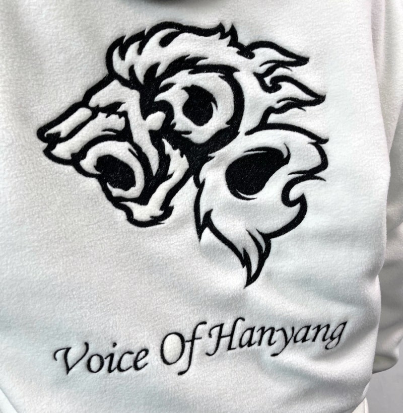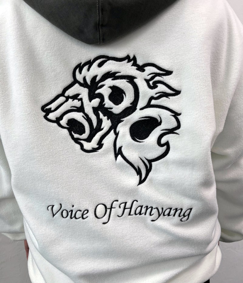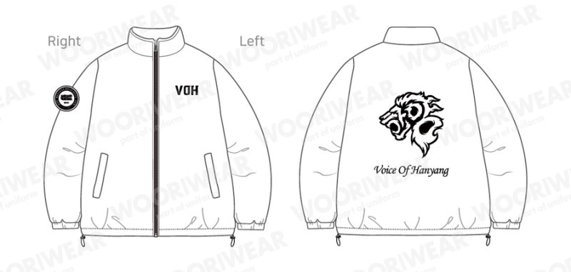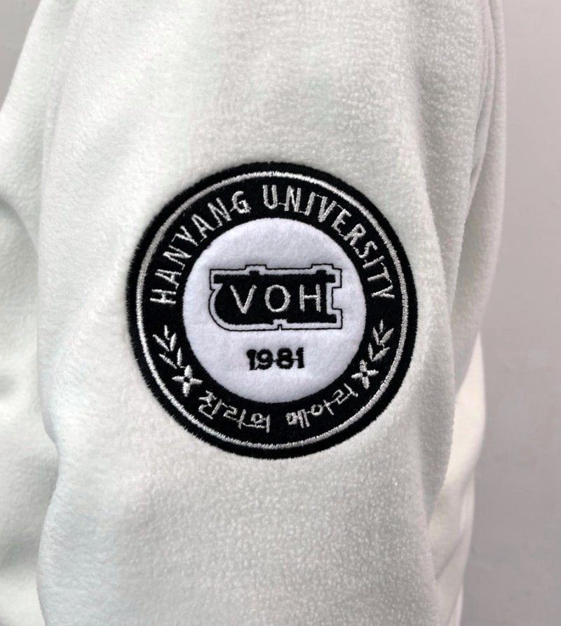 한양대학교에서는 원단 컬러를 화이트로 선택하고, 왼쪽 가슴과 오른쪽 소매, 등판에는 로고 자수를 새겨 차별화된 디자인을 완성했습니다.