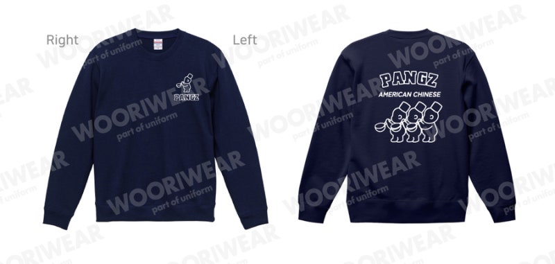 팡즈에서는 네이비 컬러를 선택해 단정하면서도 활용도가 높은 단체 유니폼 무드를 완성했습니다. 왼쪽 가슴과 등판에는 일반 날염 프린팅 방식으로 로고를 새겨 브랜드 아이덴티티를 깔끔하게 표현했으며, 무지 맨투맨 베이스 위에 로고가 선명하게 들어가 단체복과 커스텀 굿즈로 활용하기 좋은 결과물이 완성되었습니다.