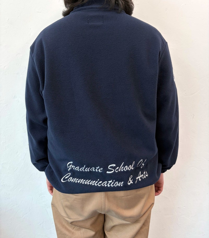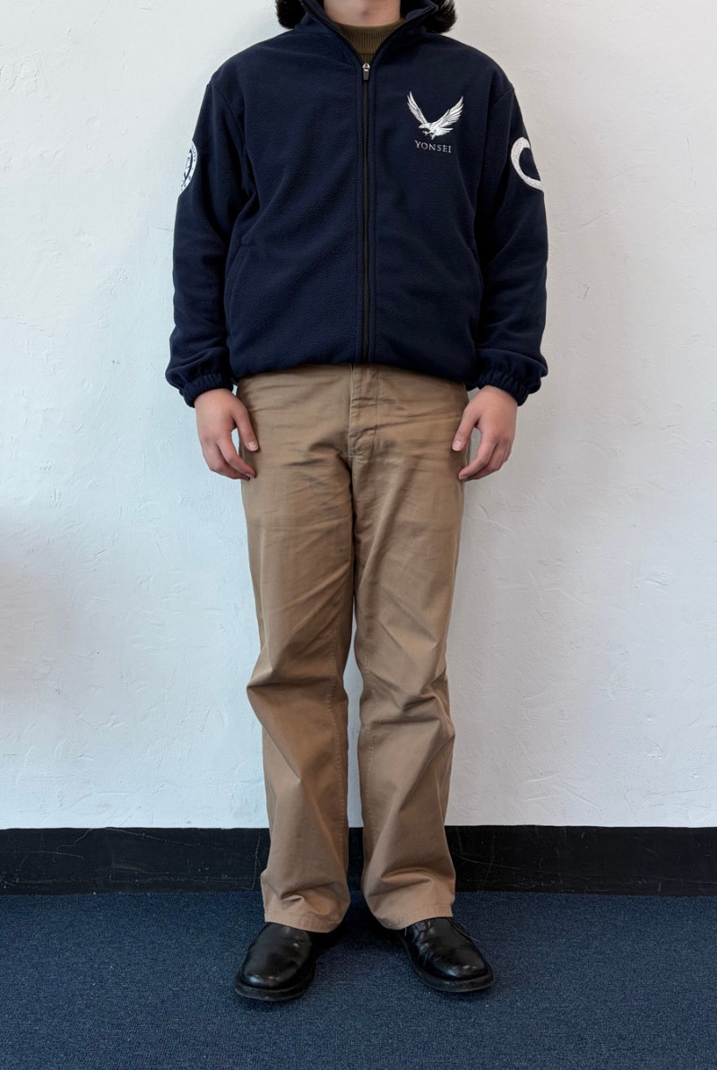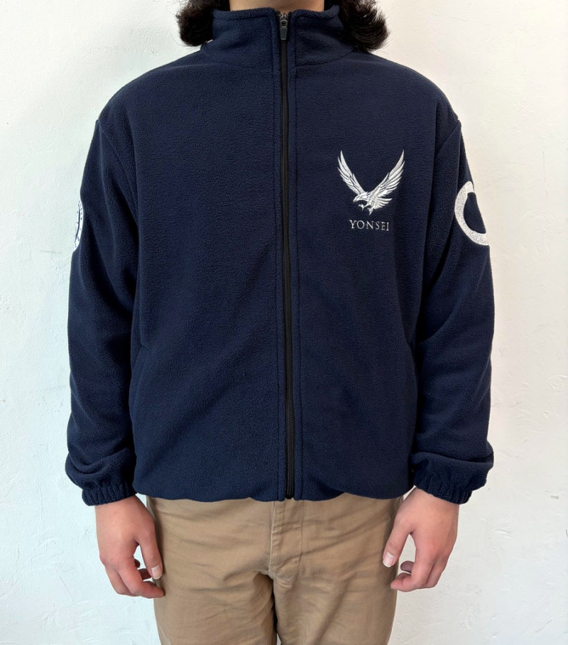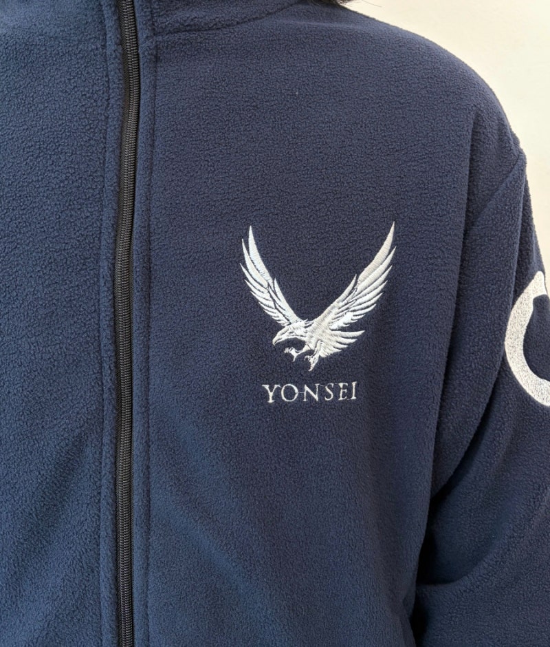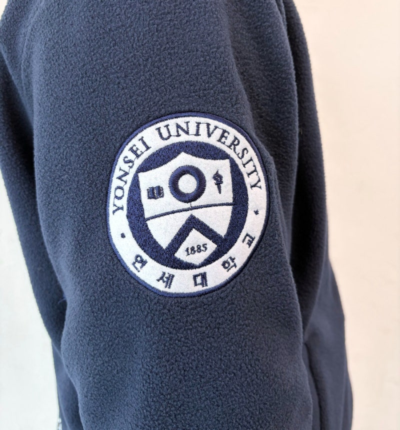 연세대학교에서는 원단 컬러를 네이비로 선택하고, 왼쪽 가슴과 양쪽 소매, 등판에는 로고 자수를 새겨 차별화된 디자인을 완성했습니다.