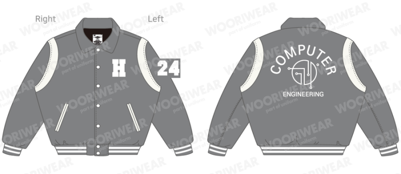 한세대학교는 라이트그레이 컬러의 하이미어 원단에 화이트 인조가죽 어깨 라인을 매치해 밝고 세련된 인상을 주었으며, 안감은 2온스 충전재 누빔 안감으로 선택하였습니다.