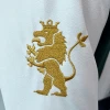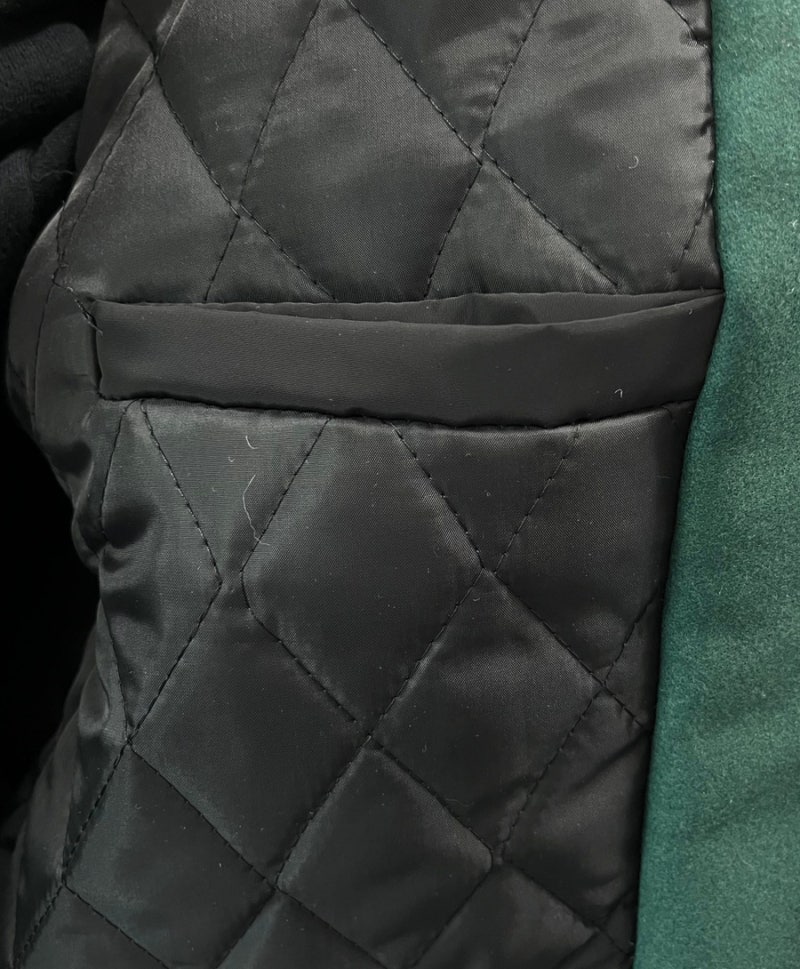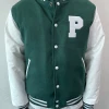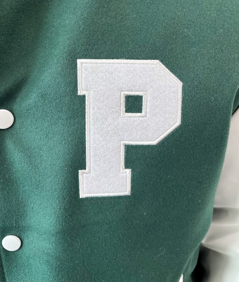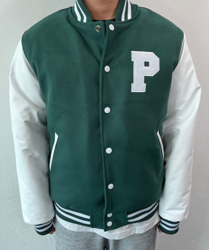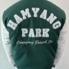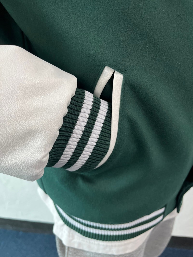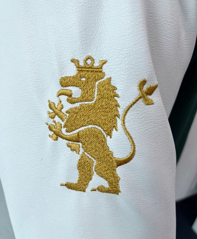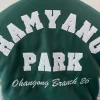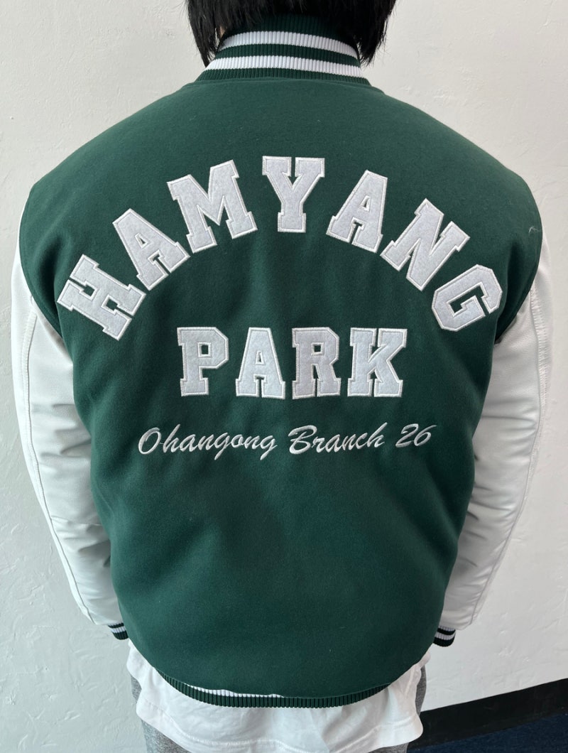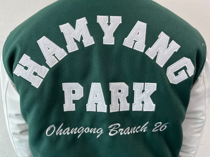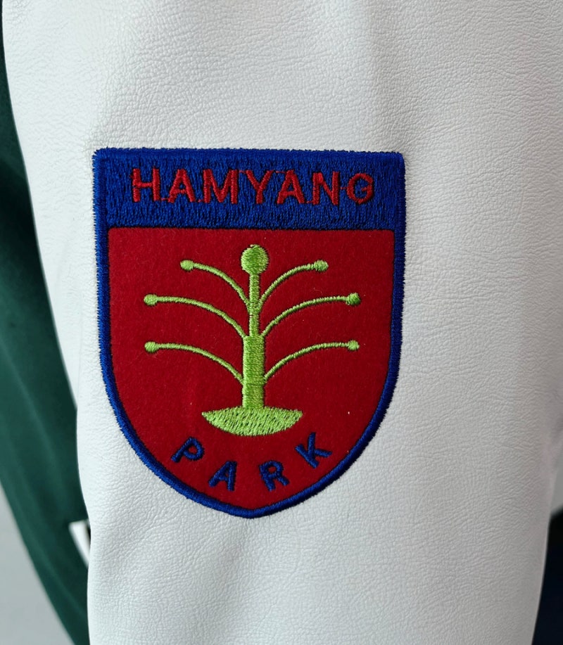 이번에 가족 단체복에서는 하이미어 원단의 포레스트그린 컬러와 화이트 인조 가죽 소매 조합을 선택해 세련되면서도 또렷한 인상을 완성했습니다. 또한 왼쪽 가슴, 양쪽 소매, 등판에는 로고를 고급 자수로 새겨 입체감과 완성도를 더했습니다. 자수는 로고가 선명하게 표현되고 착용과 관리가 반복되어도 깔끔하게 유지되기 좋아, 과잠/단체복에서 특히 선호도가 높은 방식입니다.