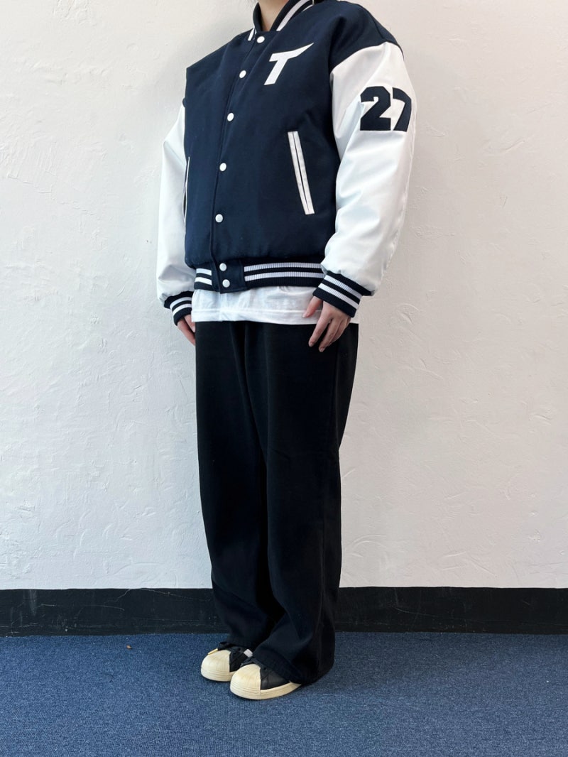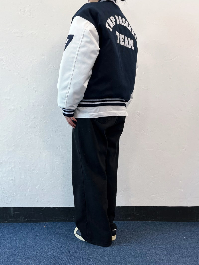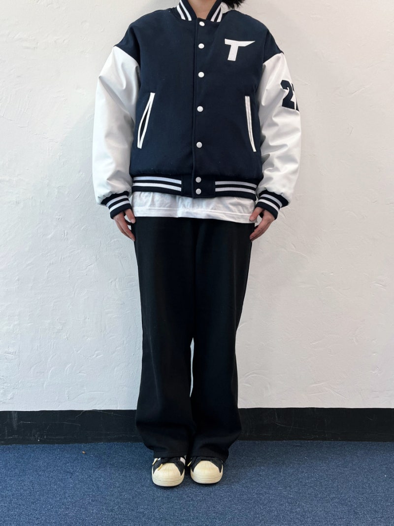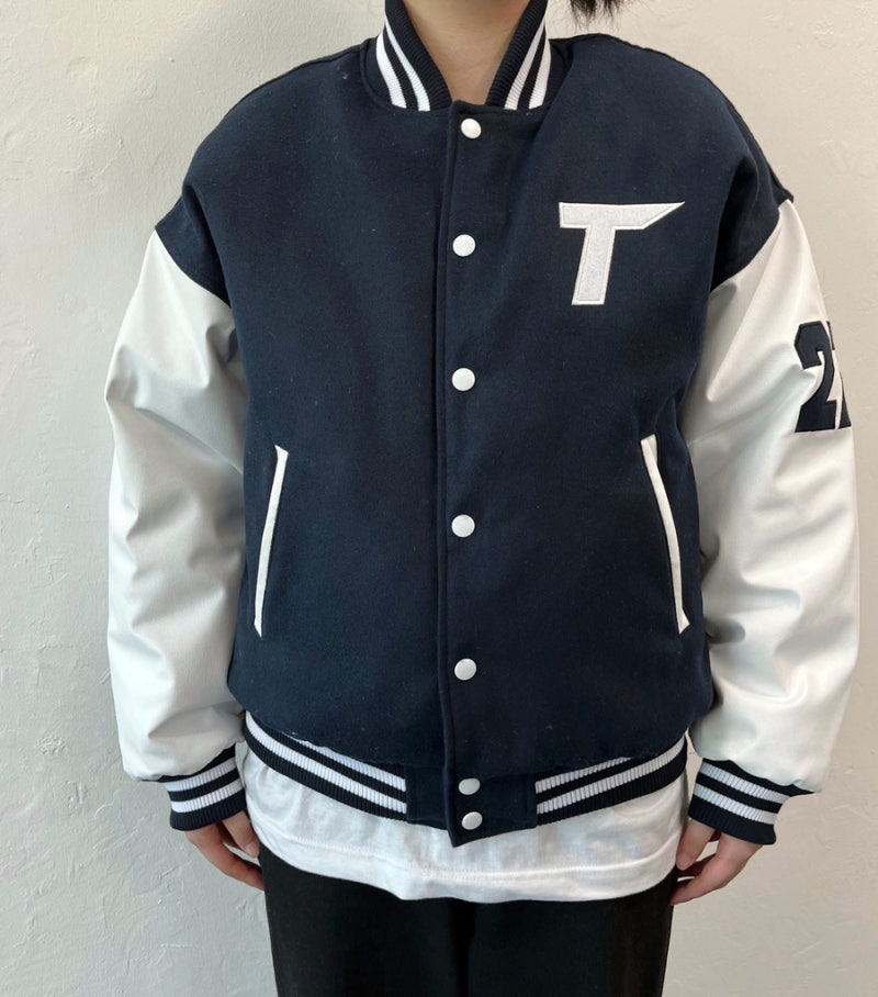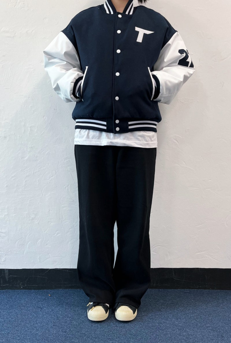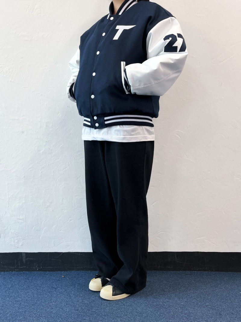 품과 어깨 라인이 여유 있게 잡혀 바시티룩 특유의 분위기가 잘 살아났습니다.