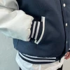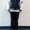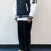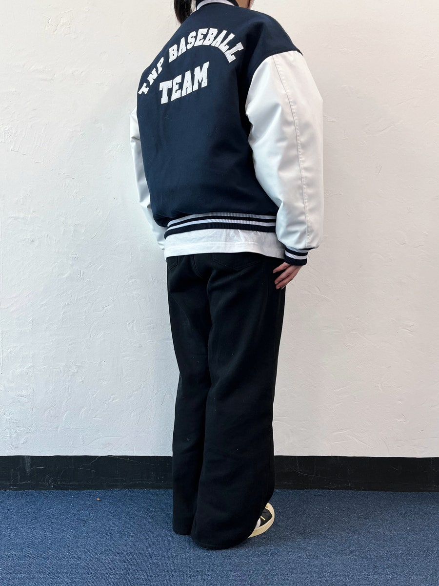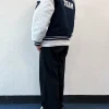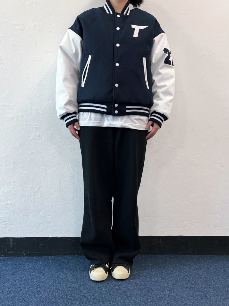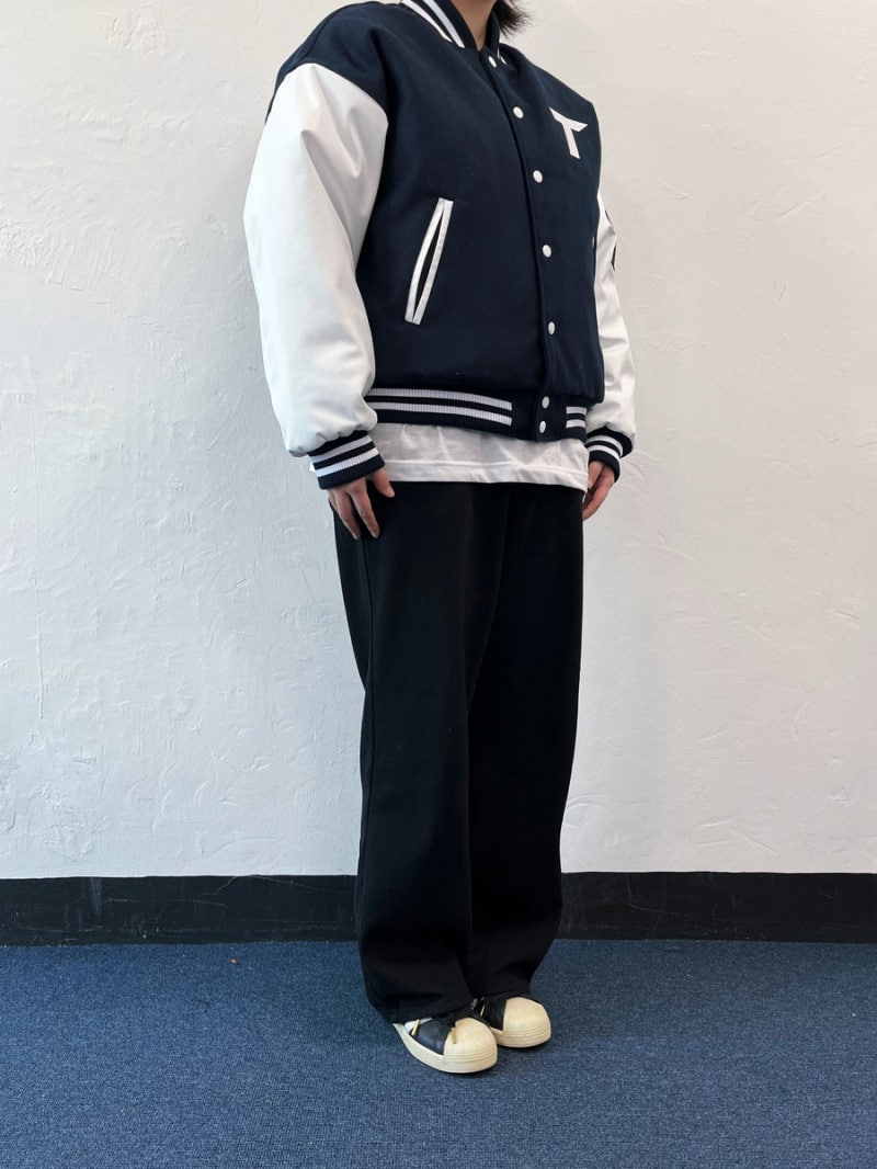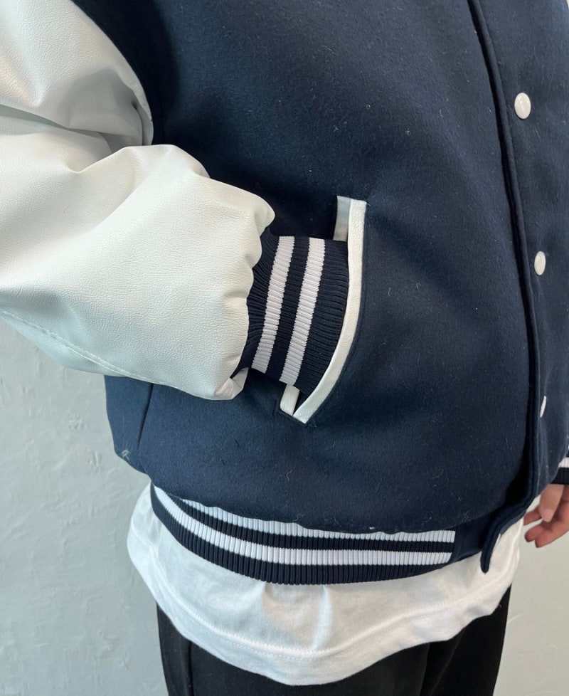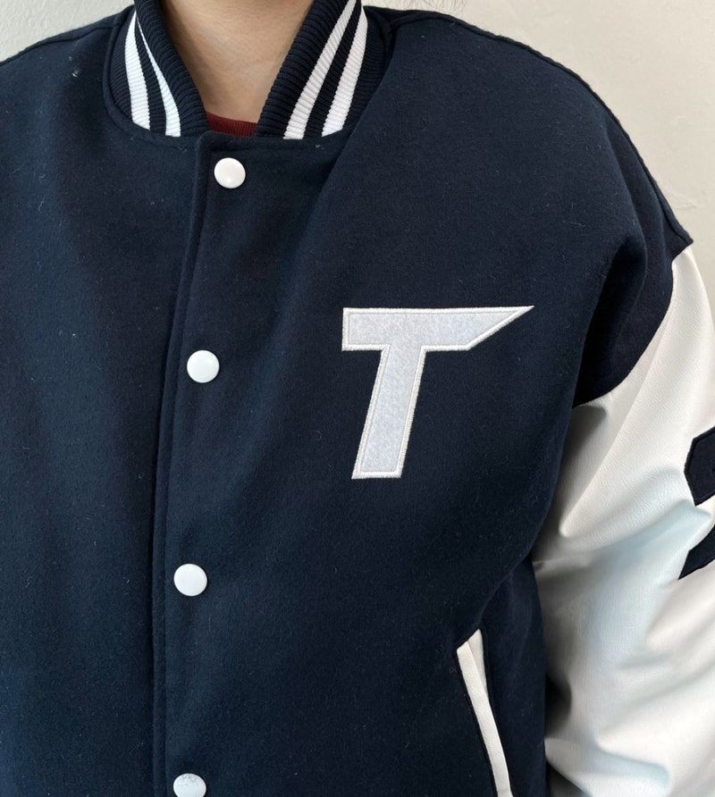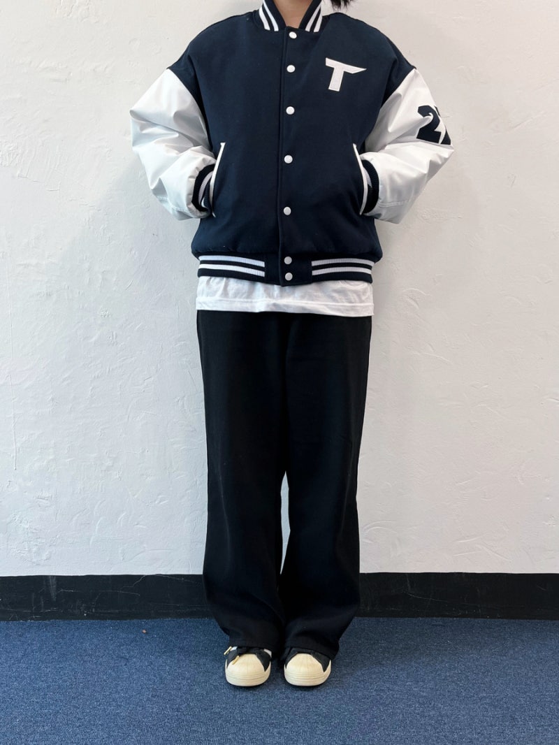 품과 어깨 라인이 여유 있게 잡혀 바시티룩 특유의 분위기가 잘 살아났습니다.
