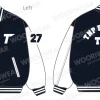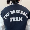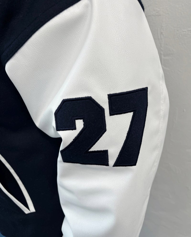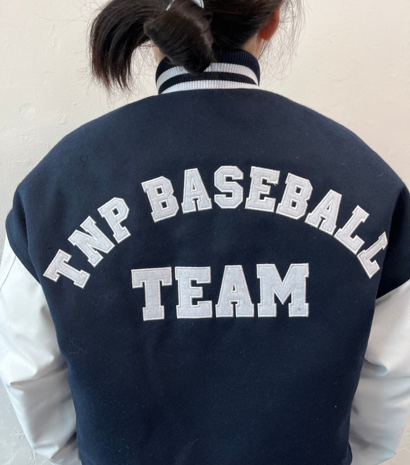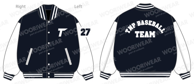 티앤피베이스볼에서는 하이미어 원단 다크네이비 컬러와 인조 가죽 화이트 조합으로 클래식한 바시티 스타일을 완성했으며, 안감은 4온스 충전재 누빔 안감을 적용해 겨울철에도 따뜻하게 착용할 수 있도록 했습니다. 로고는 왼쪽 가슴과 왼쪽 팔, 등판에 자수 방식으로 작업해 입체감 있게 표현했고, 착용과 관리가 반복되는 환경에서도 깔끔하게 유지될 수 있도록 내구성을 고려한 선택으로 티앤피베이스볼만의 아이덴티티를 강조했습니다.