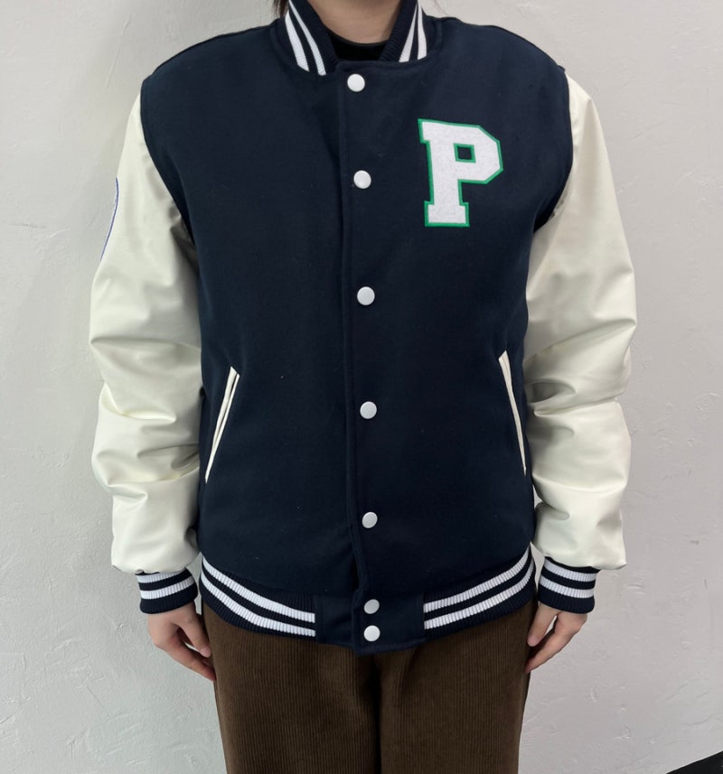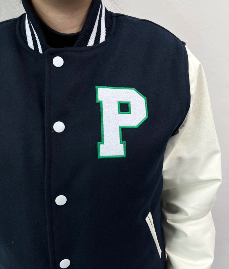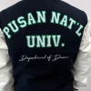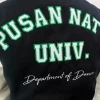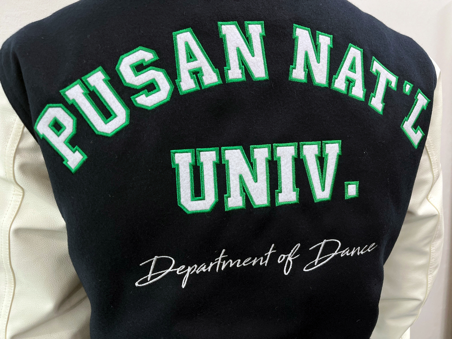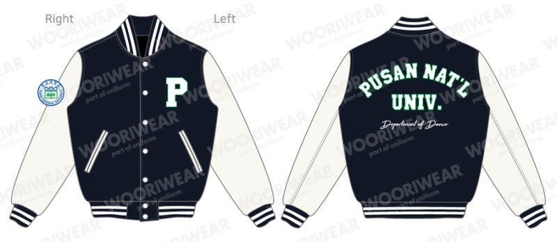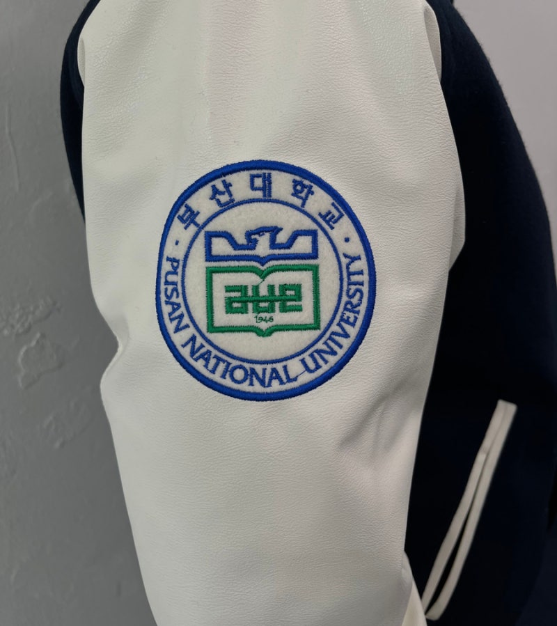 부산대학교에서는 하이미어 원단의 다크네이비 컬러와 화이트 아이보리 인조 가죽 소매 조합으로 세련되고 또렷한 인상을 완성했으며, 학교의 상징색을 감각적으로 표현했습니다. 로고는 왼쪽 가슴, 오른쪽 소매, 등판에 고급 자수로 작업해 입체감과 완성도를 더했고, 착용과 관리가 반복되는 환경에서도 로고가 깔끔하게 유지될 수 있도록 내구성을 고려해 제작했습니다.