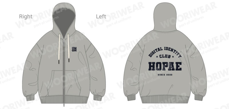 호패에서는 베이직하면서도 단체복에 잘 어울리는 멜란지 컬러를 선택했으며, 로고는 왼쪽 가슴과 등판에 자수 방식으로 작업해 입체감 있게 표현했습니다. 자수는 로고가 선명하고 고급스럽게 드러나며, 착용과 세탁이 반복되어도 깔끔하게 유지되기 좋아 프리미엄 과잠과 과잠바에 특히 잘 어울리는 방식입니다.