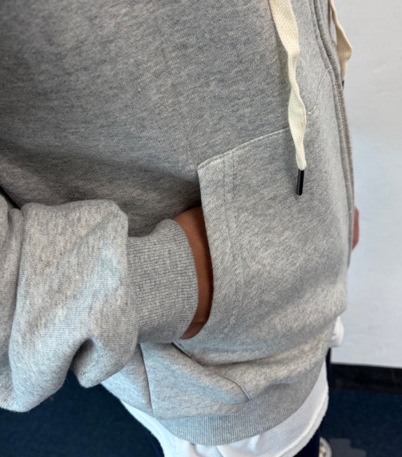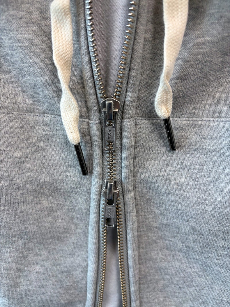 전체 봉제는 갈라 삼봉 봉제를 적용해 내구성을 높였고, YKK 니켈 투웨이 지퍼를 사용해 착용 상황에 따라 다양한 스타일 연출이 가능합니다. 후드는 여유 있는 사이즈로 제작되어 후드핏이 자연스럽게 잡히며, 아일렛과 스트링 팁 디테일까지 더해 작은 부분까지 완성도를 높였습니다.
