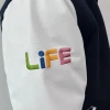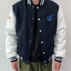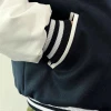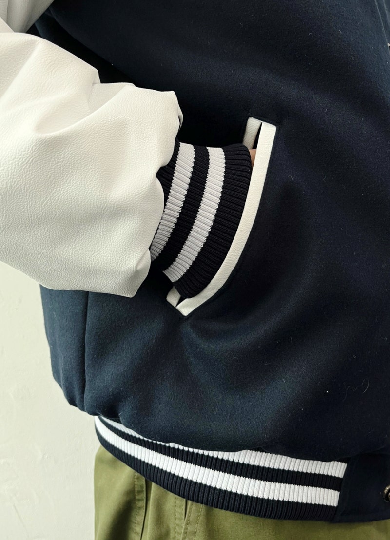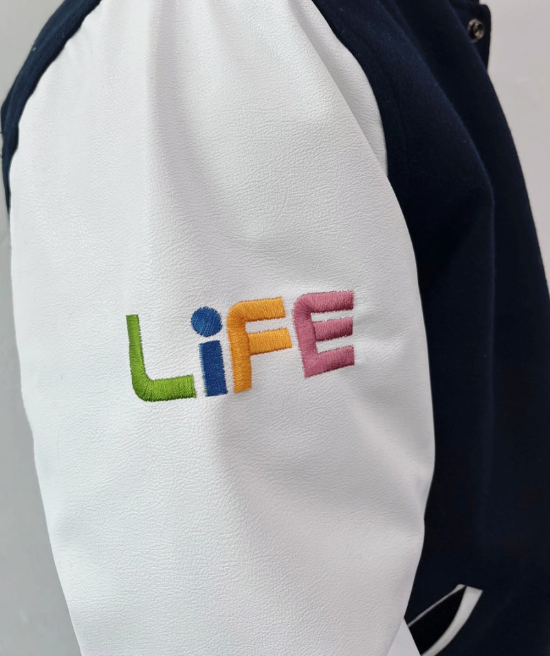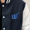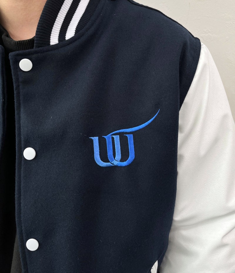 이번에 위덕대학교에서는 하이미어 원단의 다크네이비 컬러와 화이트 인조 가죽 소매 조합을 선택해 세련되면서도 또렷한 인상을 완성했습니다. 또한 왼쪽 가슴, 오른쪽 소매에는 로고를 고급 자수로 새겨 입체감과 완성도를 더했습니다. 자수는 로고가 선명하게 표현되고 착용과 관리가 반복되어도 깔끔하게 유지되기 좋아, 과잠/단체복에서 특히 선호도가 높은 방식입니다.