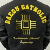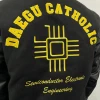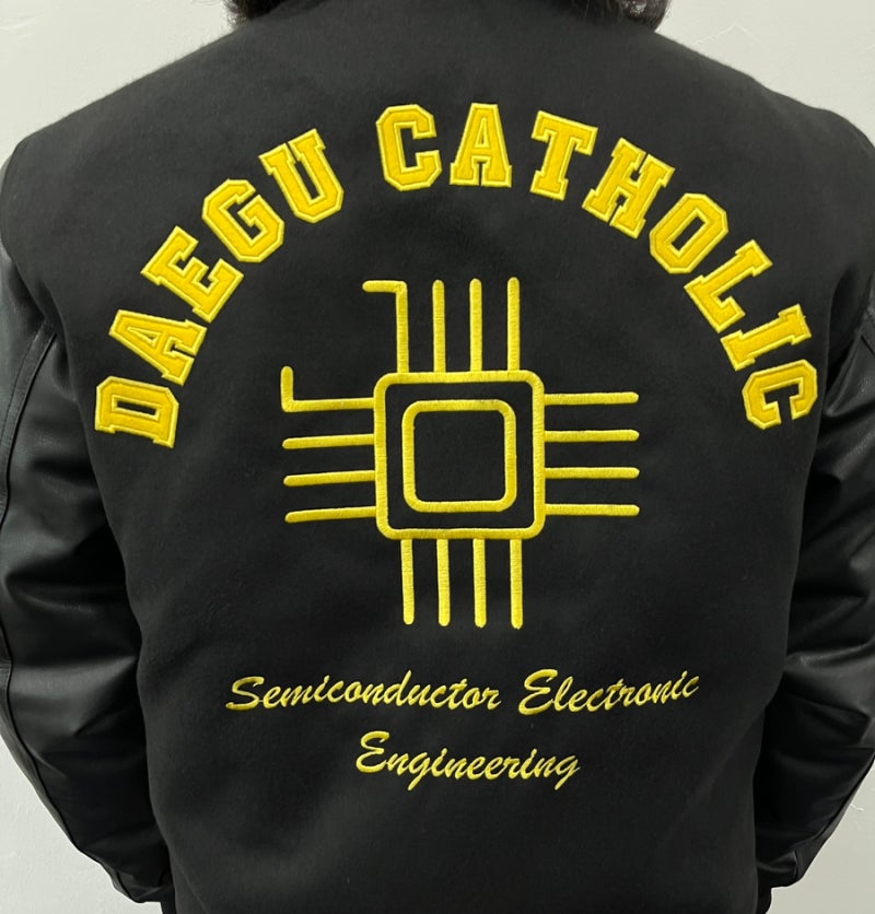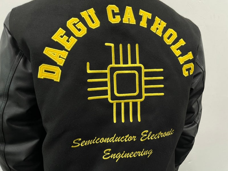 대구가톨릭대학교에서는 하이미어 원단의 블랙 컬러와 블랙 인조 가죽 소매 조합으로 세련되면서도 또렷한 인상을 완성했습니다. 로고는 왼쪽 가슴, 왼쪽 소매, 등판에 고급 자수로 작업해 입체감과 완성도를 더했으며, 자수 특유의 선명한 표현력과 내구성 덕분에 착용과 관리가 반복되는 과잠/단체복 환경에서도 깔끔하게 유지되기 좋습니다.