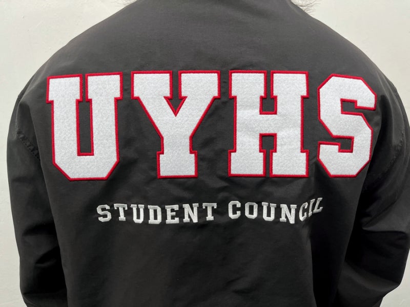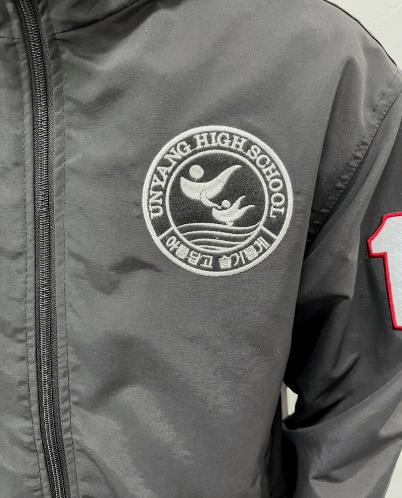 운양고등학교에서는 블랙 컬러를 선택해 어떤 스타일에도 잘 어울리는 베이직한 무드를 완성했으며, 왼쪽 가슴과 양쪽 소매, 등판에 자수 방식으로 작업해 입체감 있게 표현했습니다. 자수는 로고가 선명하고 고급스럽게 드러나며, 착용과 관리가 반복되는 환경에서도 깔끔하게 유지되기 좋아 단체복에서 특히 선호도가 높은 방식입니다.