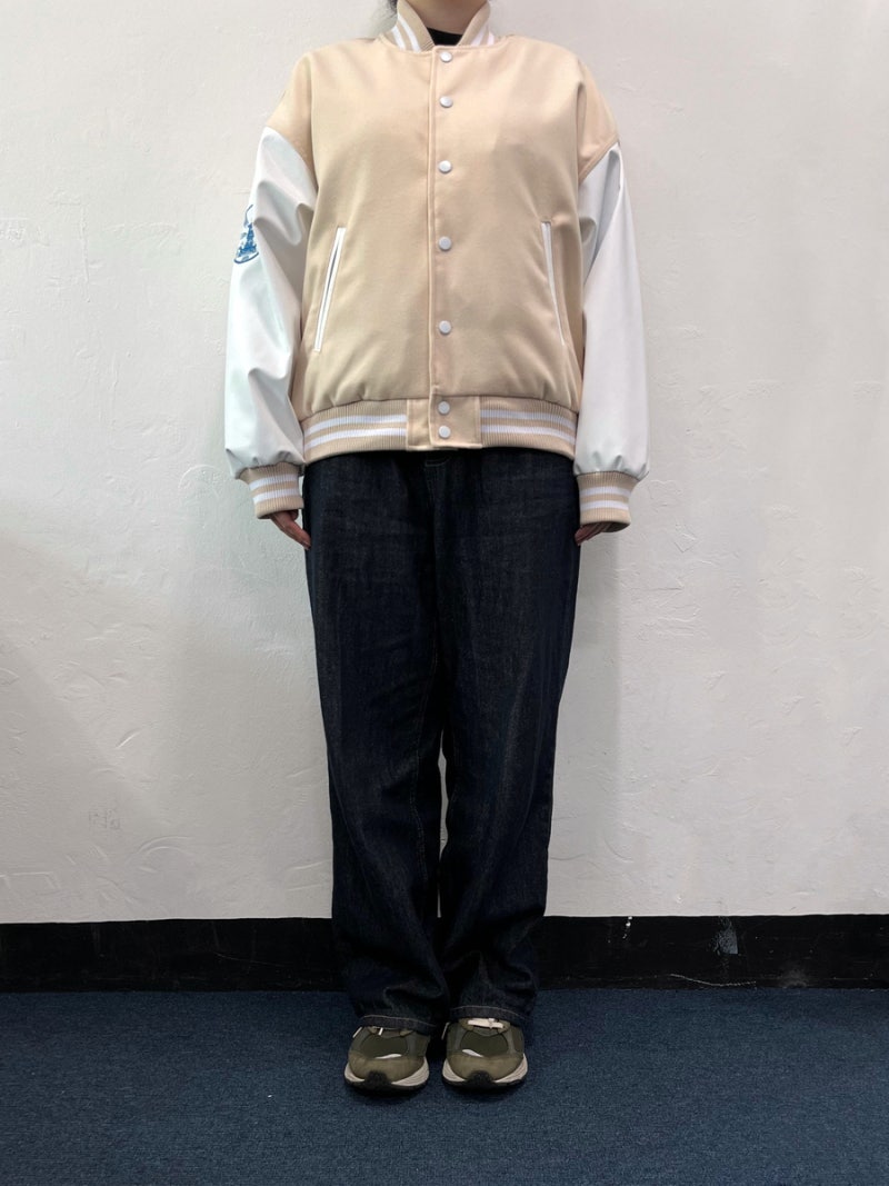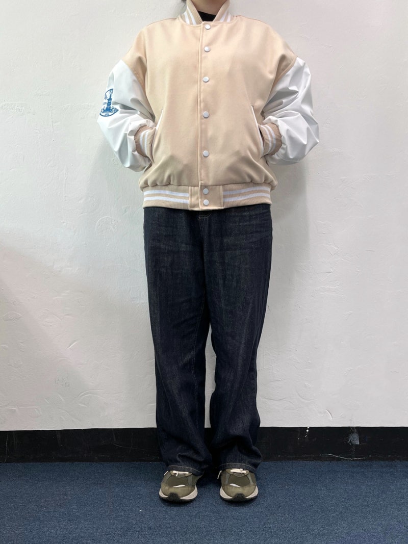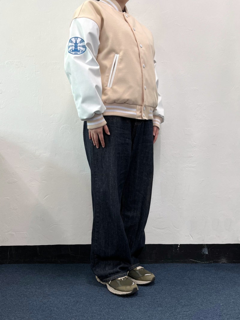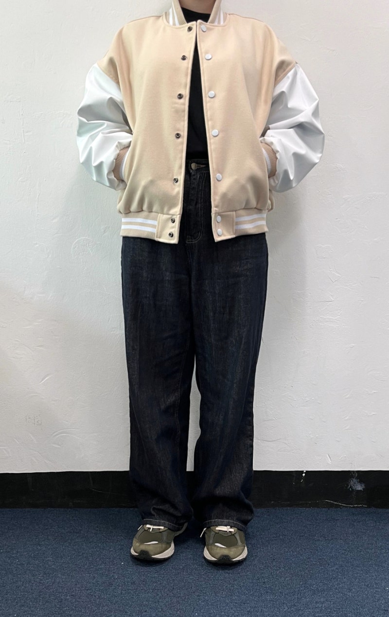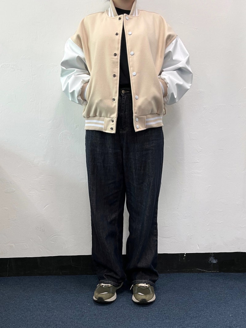 품과 어깨 라인이 여유 있게 잡혀 바시티룩 특유의 분위기가 잘 살아났습니다.