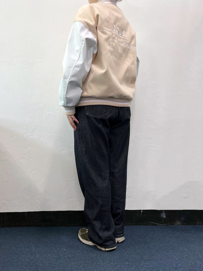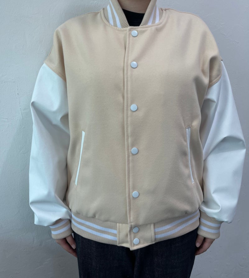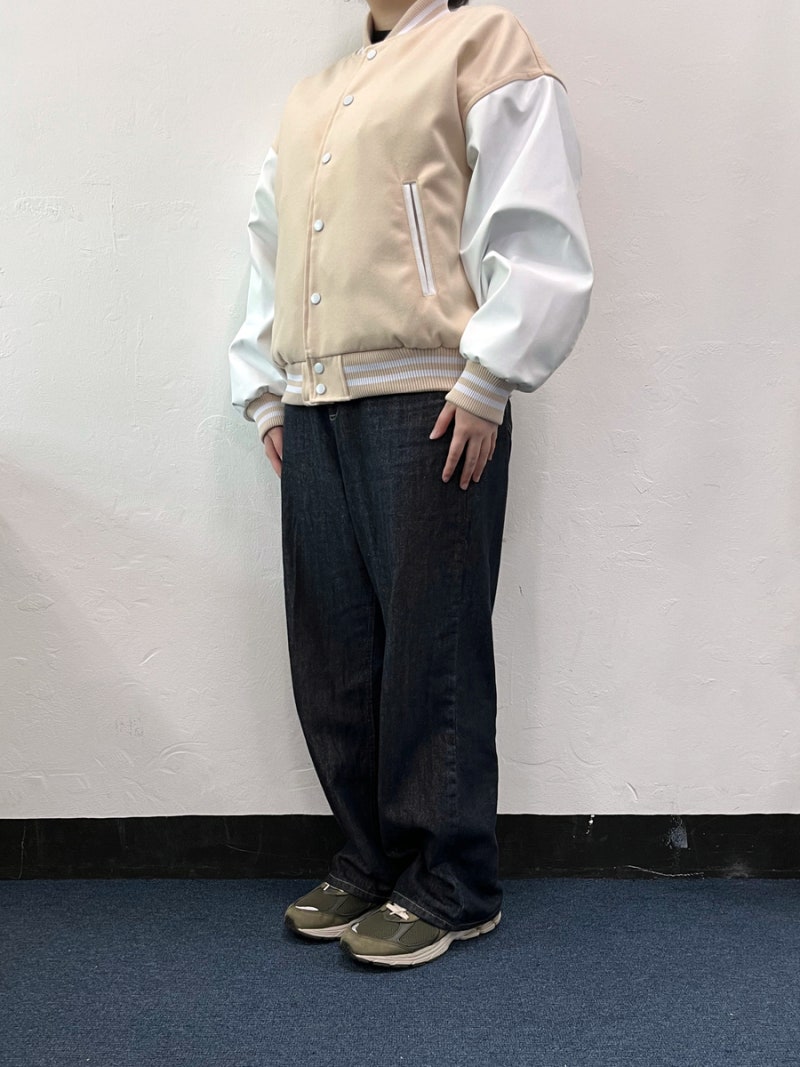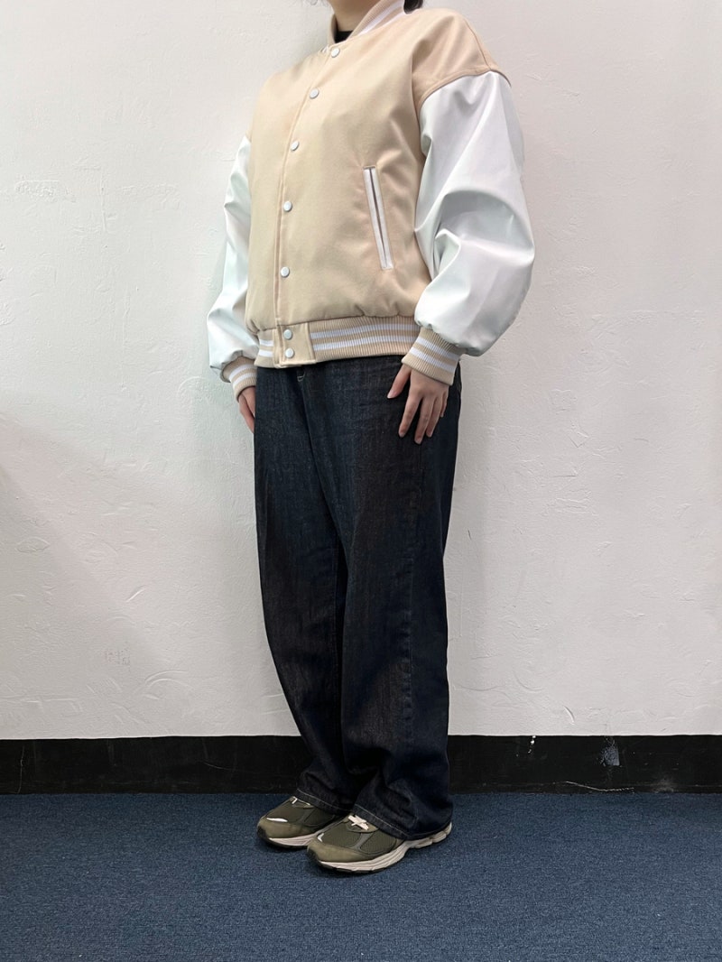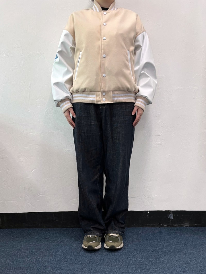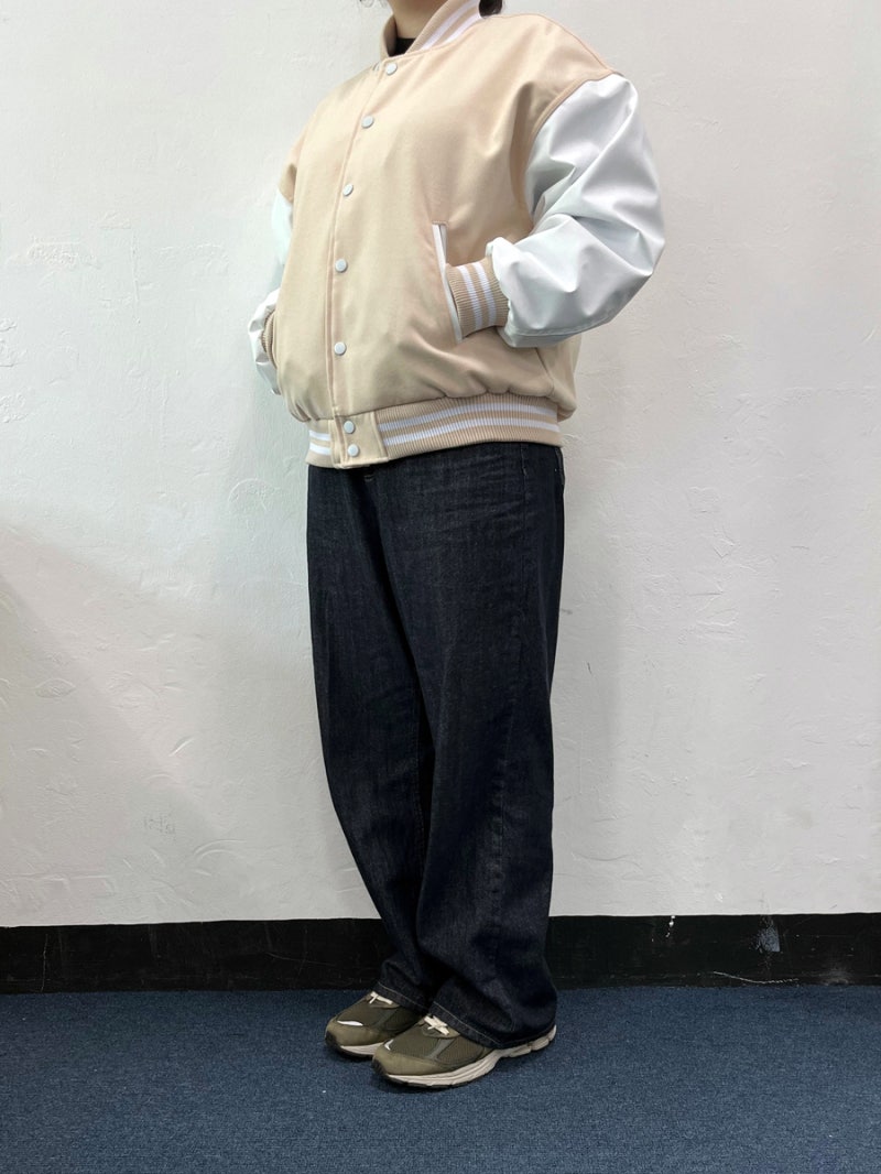 품과 어깨 라인이 여유 있게 잡혀 바시티룩 특유의 분위기가 잘 살아났습니다.