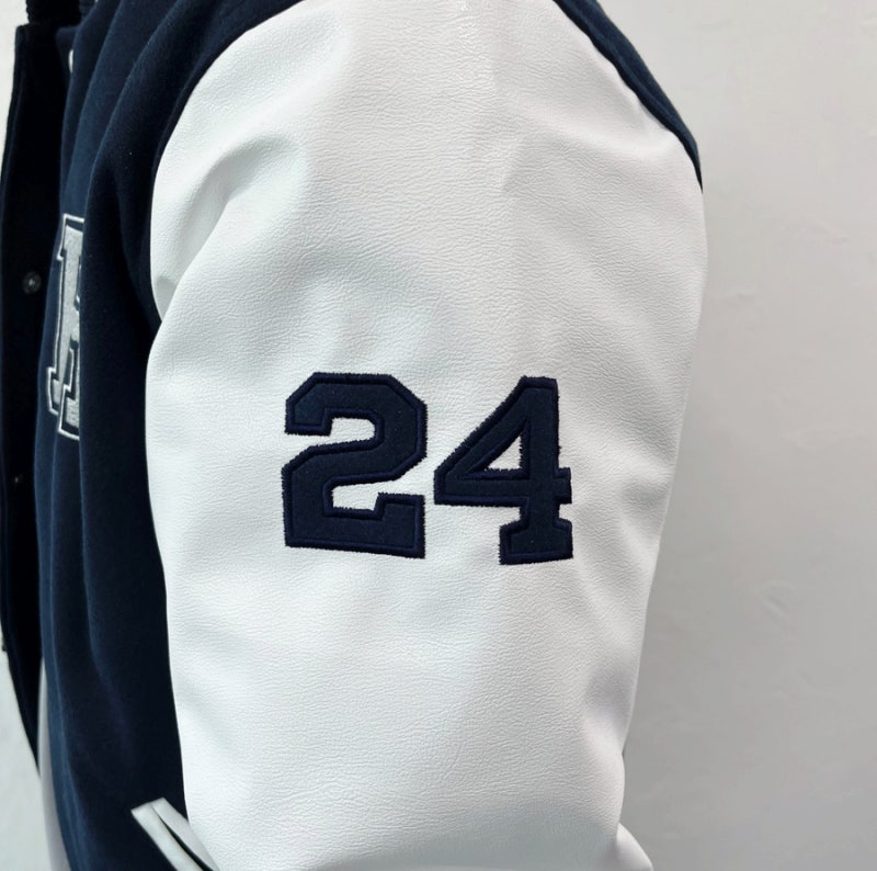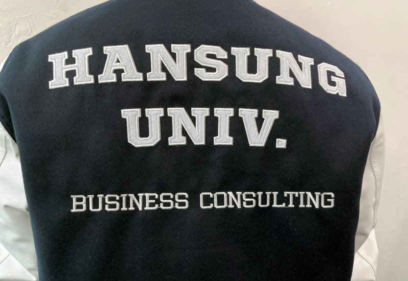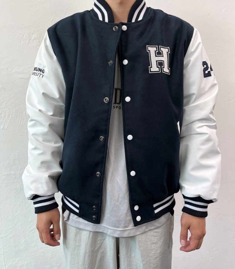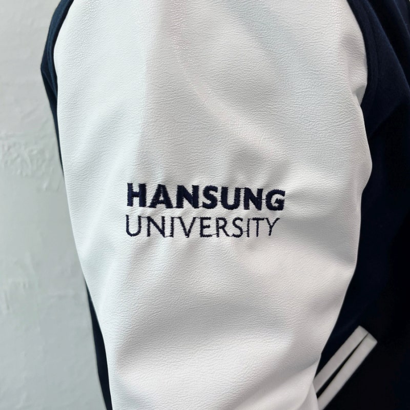 한성대학교에서는 다크네이비 하이미어 원단과 화이트 인조 가죽 소매 조합으로 세련되고 또렷한 인상을 완성해 학교 상징색을 감각적으로 표현했습니다. 로고는 왼쪽 가슴·양쪽 소매·등판에 고급 자수로 작업해 입체감과 완성도를 더했으며, 착용과 관리가 반복되는 과잠 환경에서도 로고가 깔끔하게 유지될 수 있도록 내구성을 고려해 제작했습니다.